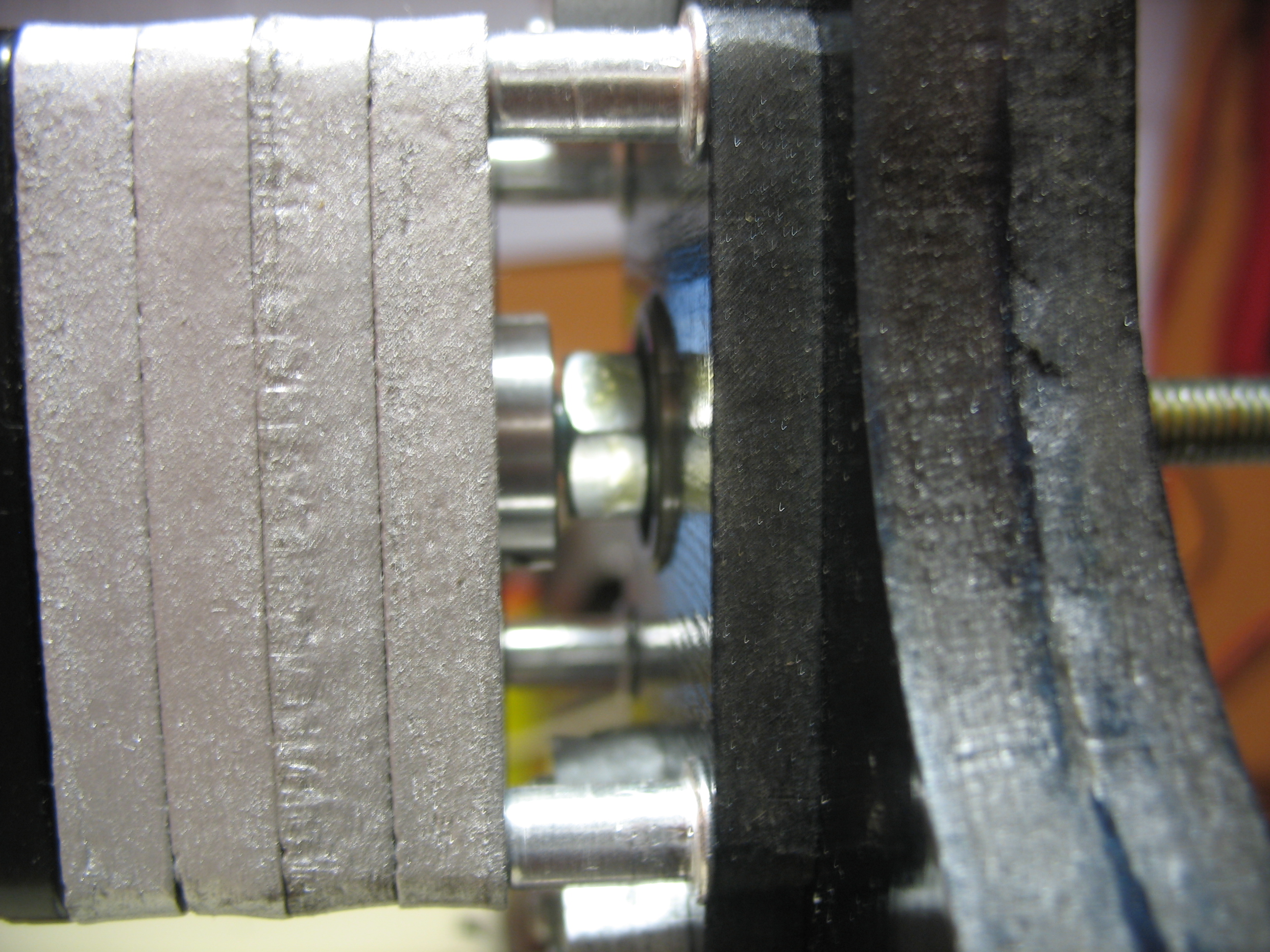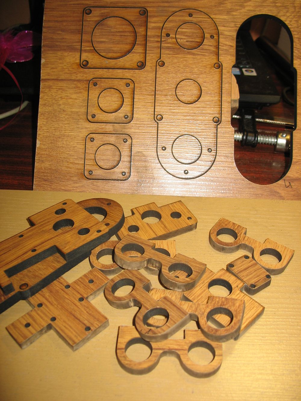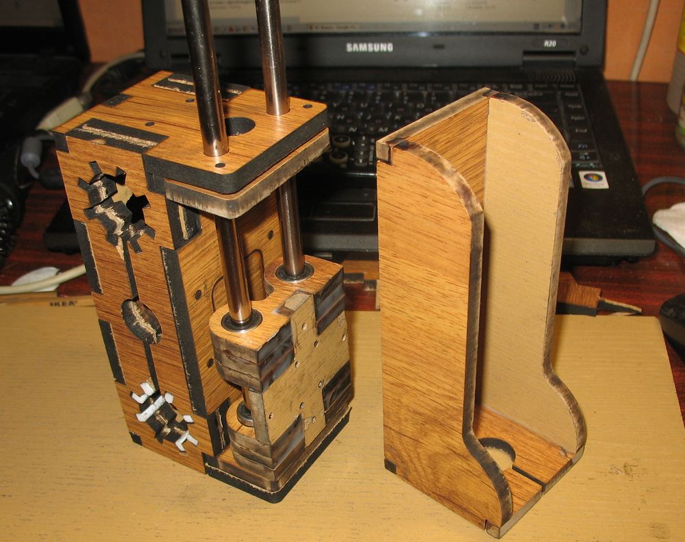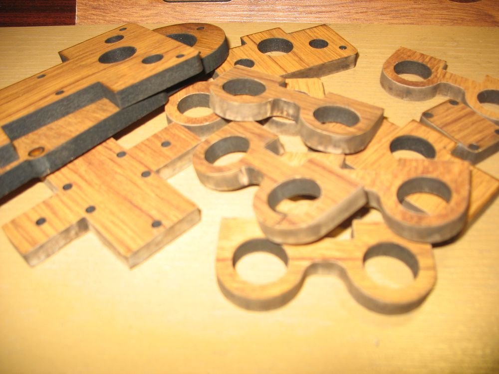 В общем начертил разложил по листам ламината и пошел на лазерную резку. СО Лазер сука острый )))) Опытным путем пришли к тому что после каждого листа линзы лазеру надо чистить а то они засираются и если это не сделать второй лист уже будет не прорезаться до конца, детали придется выколупывать ножем, а это не есть гуд.Вот на фото слева пример грани нормально отрезанной детали и справа непрореза. Для отверстий валов делайте учет -0.2мм после сдирания горелок все плотненько встанет, на внешние габариты пофиг, клей все исправит. На резку ушло 1800руб.
