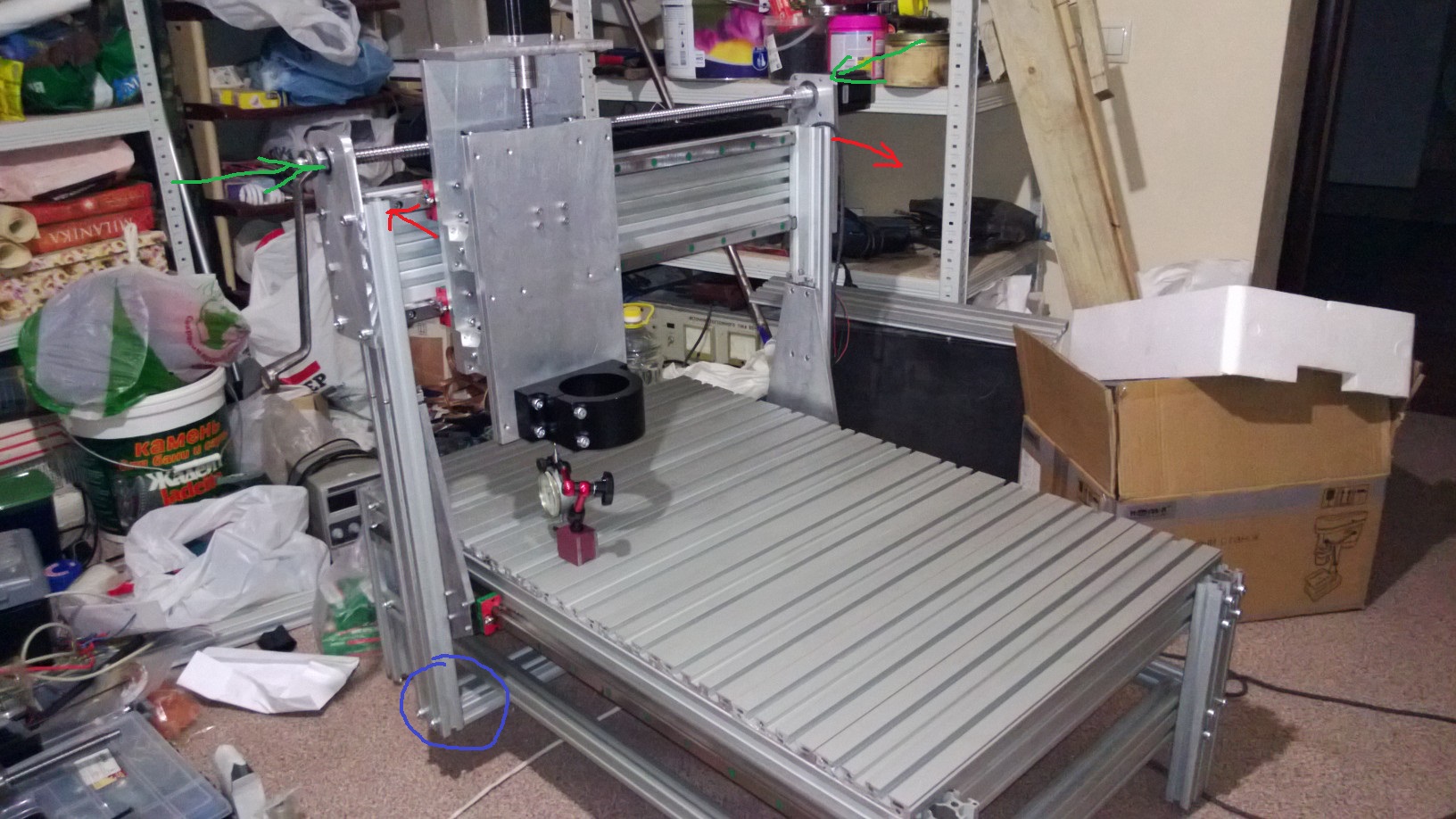 Высота портала значительно выше чем у меня , а это больше рычаг. У меня на концах трубы (направляющей) расположены большие шайбы серебрянные, труба к ним притягивается за счет шпильки которая проходит насквозь всю трубу и стягивается гайками, эти гайки посажены на фиксатор резьбы средней жесткости, а сами шайбы прикручиваются шурупами к стенкам портала. Если портал выведен в крайнее положение по Х все сидит очень жестко, может и есть какие микроны но как их померять. В таком положении при давлении по зеленой стрелке жесткость определяет стенка портала, это 2е склеянные эпоксидкой ламинатные доски по 8 мм. итого 16мм, габариты детали при этом 287*150 , можно склеять и померять на сколько они гнуться я не знаю как это сделать. Когда портал выезжает на середину Х начинает гнуться при такой длине. В направлении красных стрелок вроде все жестко. Посмотрим когда станок чтото изготовит. Напомню что пилить он будет бальзу и фанеру.