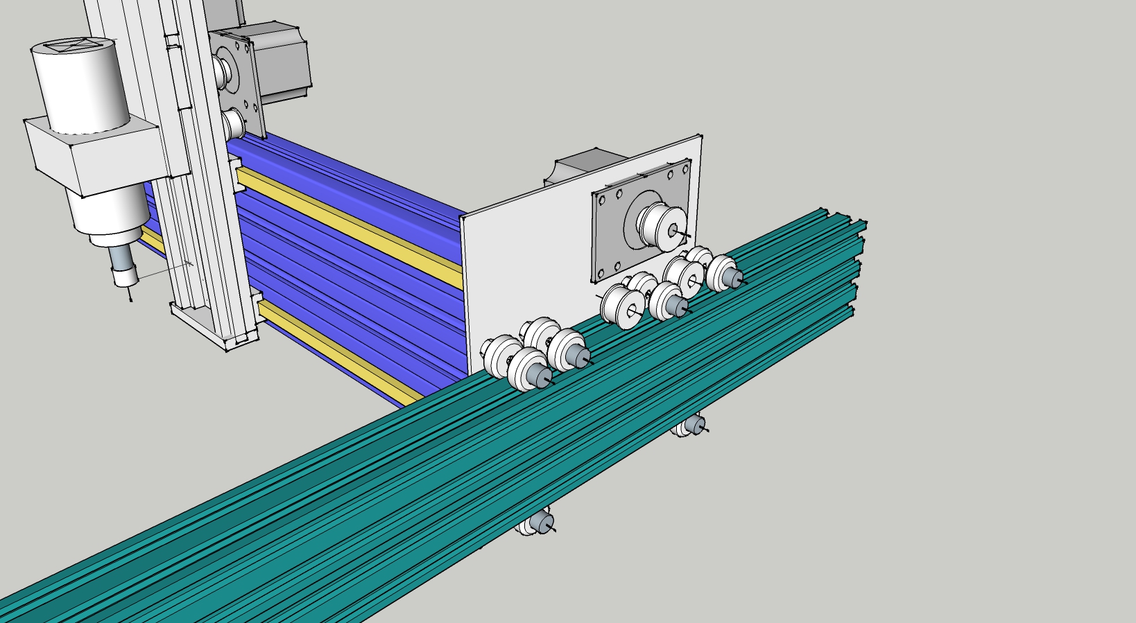 Два ходовых винта на оси Х лишнее, поставь один, а направляющие несколько сдвинь к центру, не уменьшая области рабочей зоны. Т.е. "силовые направлющие" пусть будут несколько ближе к ходовому винту, чем места крепления боковых порталов. В итоге динамический контур оси Х (направляющие - ходовой винт) будет более устойчив к возможному его перекашивания при нагрузках.