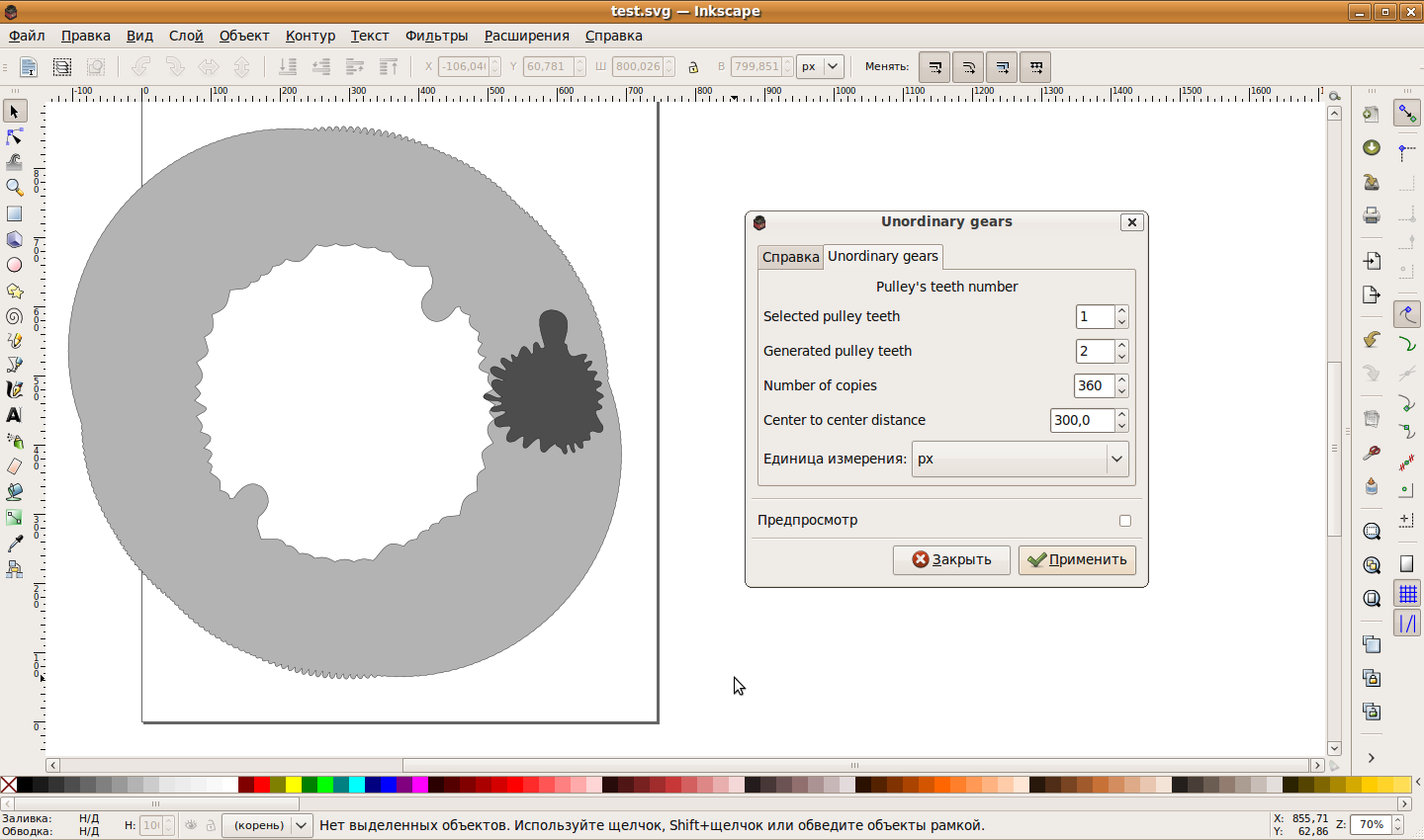Unordinary gears это расширение векторгного графического редактора Inkscape, предназначенное для создания необычных или фигурных шестеренок. Мы привыкли видеть круглые шестеренки, но иногда становится скучно и хочется чего-то особенного, ведь вокруг столько много разных форм :). Unordinary gears рисует ответную шестеренку для произвольной фигурной шестеренки заданной пользователем.