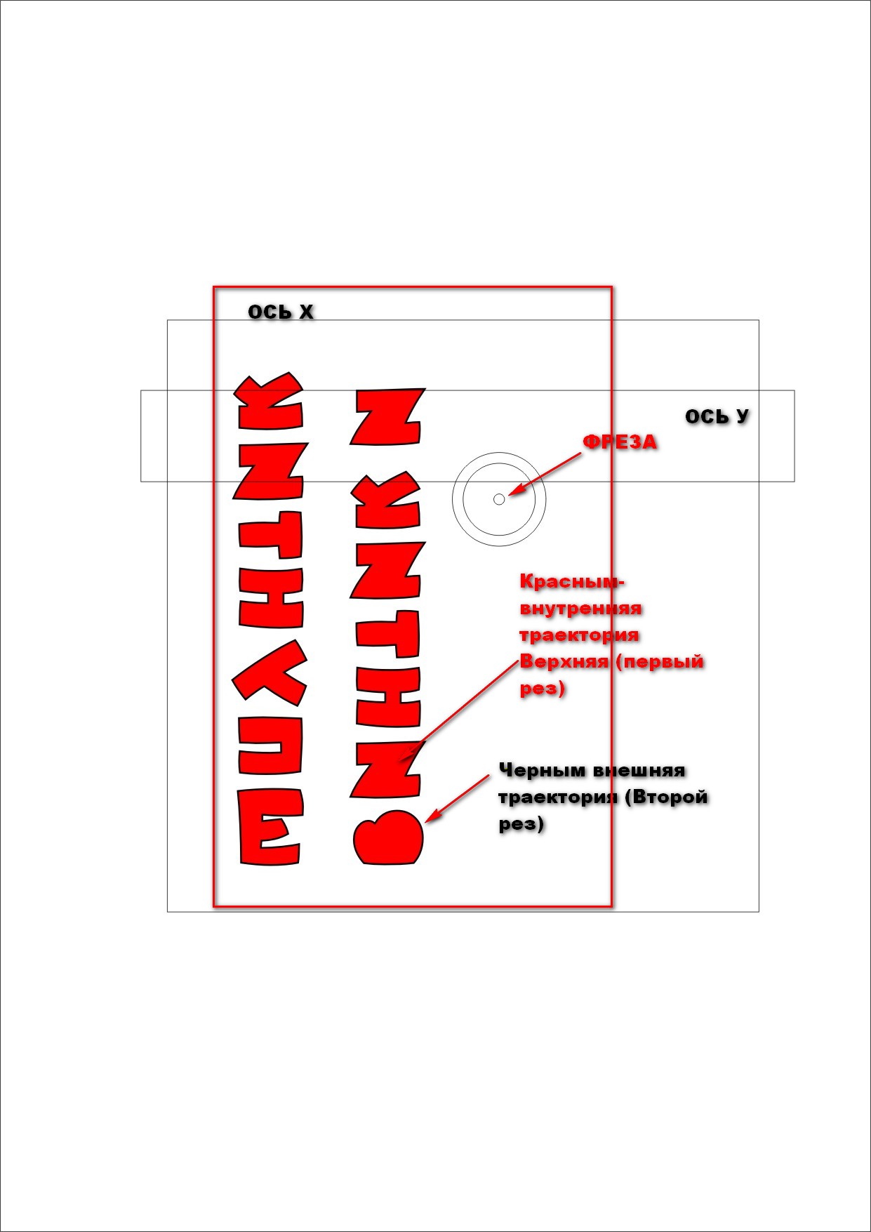 Долго думал че же это такое, потом допер выставить "ноль" в дальнем правом углу станка. Фреза с начала запуска УП поехала влево и ко мне, и заготовка начала обрабатываться вверх ногами. Т. е с переворотом на 180 градусов. Как на картинке.
