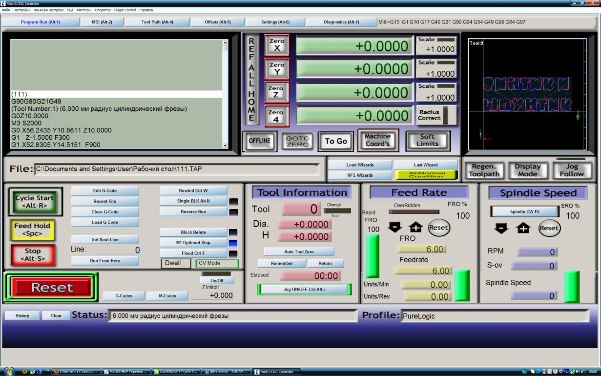 Создал у Арткаме УП с нулевой точкой в левом нижнем углу, сохранил с построцессором gcode_mm.con, скормил её программе, и тут начались непонятки. Когда загружаю УП в Mach, там всё отображается правильно, лицевой стороной, с нулевой точкой слева внизу.