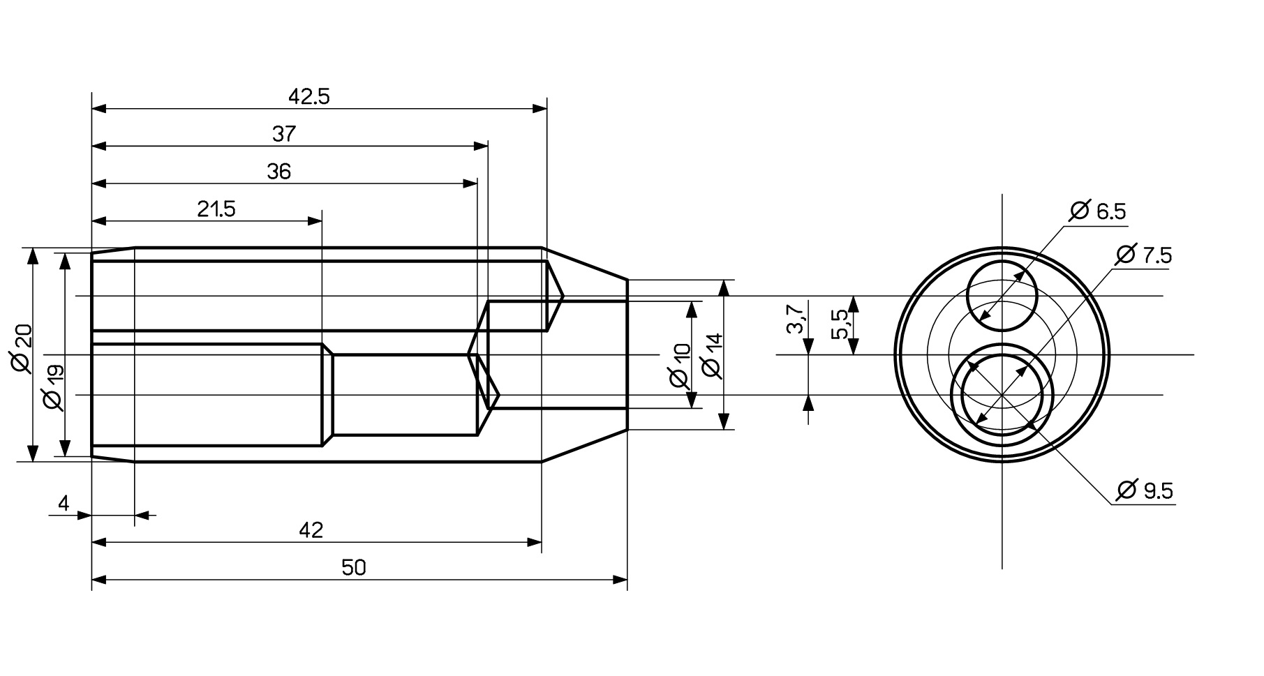 Эскизы сделаны немного не корректно, поясню: Деталь_1 цилиндрическая деталь, справа (по эскизу) одно отверстие, слева два, одно из которых ступенчатое.