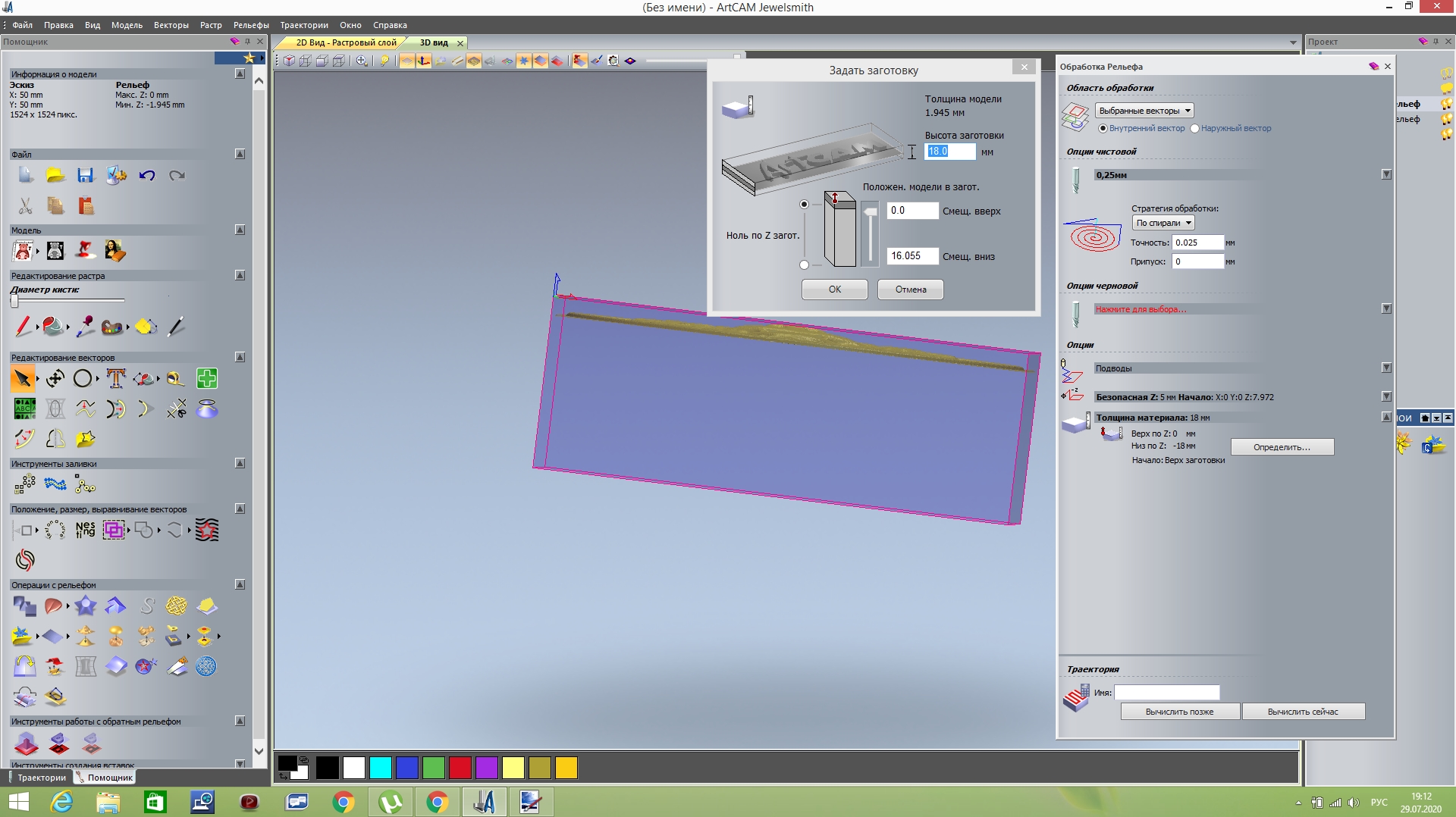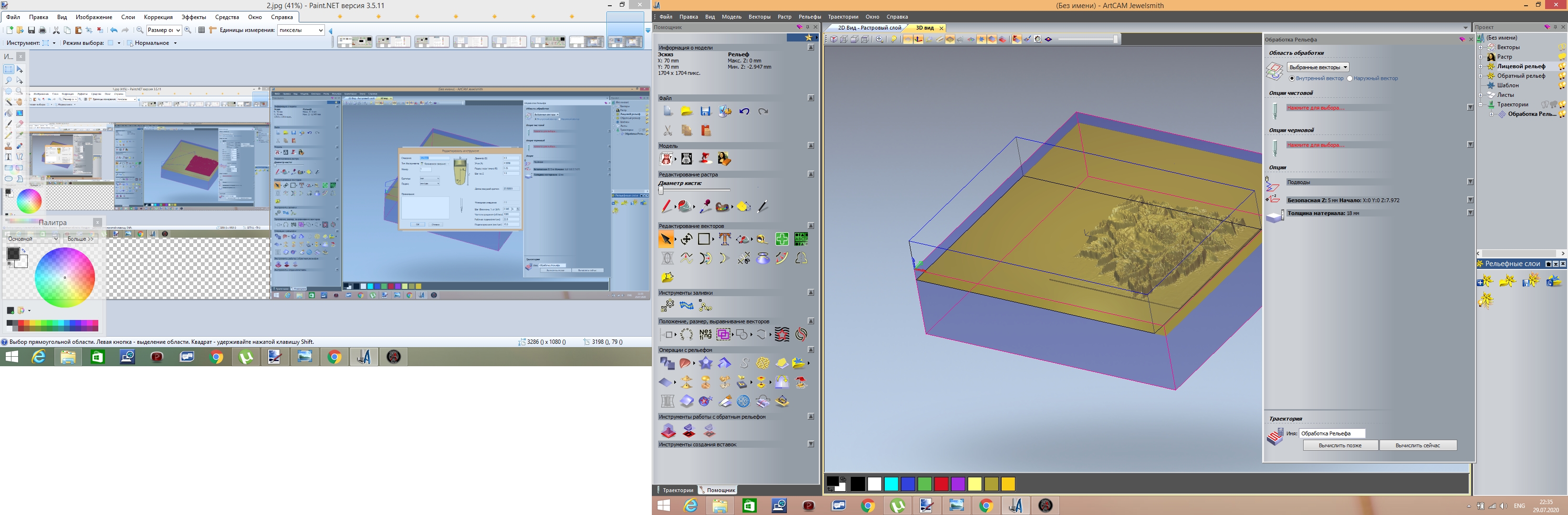 Ниже я еще скинул фото рельеф которые делал ранее, указав высоту по Z=7мм, в итоге к концу УП его просто вырезало из заготовки в 18мм толщиной.