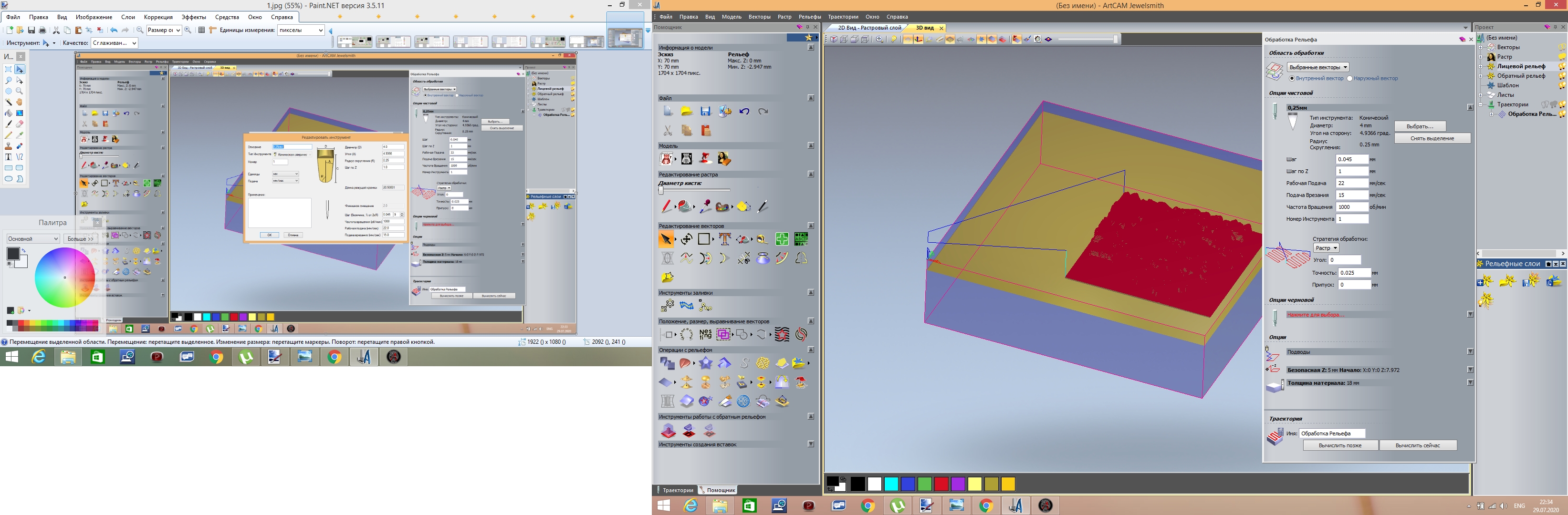 Делаю рельеф 3д, получается плавно рельеф утопает.. Как видно, если делаю обработку по спирали то рельеф по кругу плавно опускается превращаясь в сферу , а если обработка растр то видно что вначале первые 5 минут нужная высота и потом плавно уходит всё ниже и ниже рельеф...