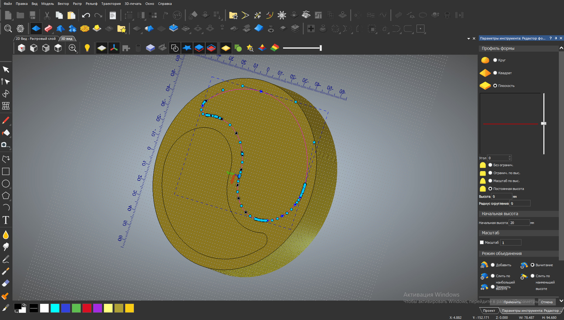 Потом выбираю вектор для выборки, указываю Профиль формы - плоскость, Постоянная высота, Начальная высота - 20 мм, режим объединения - вычитание. Нажимаю применить и ничего не получаю.