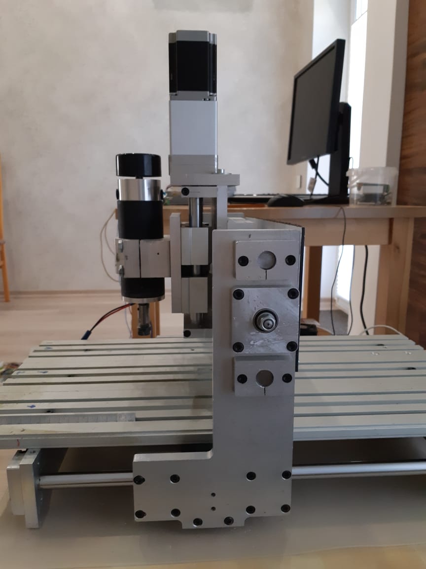 Теперь что есть - конструкция из Д16 или Д16Т толщиной 12 мм. По оси Х швп 1605 с гайкой, остальные оси винт-гайка трапеция, гайки - латунь. Опоры валов на оси X китайские, остальные из алюминия самодельные. Сами валы простые цилиндрический Ф16 мм. Моторы 57BIGH627. Tb660 без корпусов и плата подключения через usb. Провод usb. Блоки питания МинВэл для шаговиков и для шпинделя на честные китайские 500 w с воздушным охлаждением. Стол из тяжёлого профиля из Воронежа. Остальное смотрите пожалуйста на фото, ибо грешен, туповат в этой области. Ещё один важный момент (я прям оптимист, завтра, мол, купят) - станок на даче, привезти смогу не раньше чем через неделю, ибо жру антибиотики.