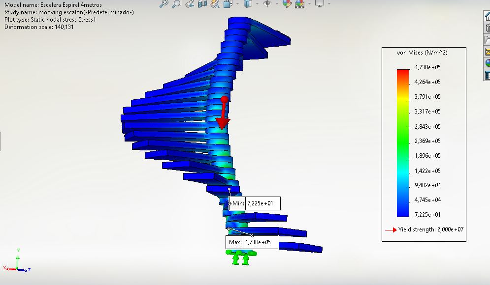 Смещение верхушки на 2,5миллиметра от гравитации, сила приложенная к материалу в пределах нормы, видим что на нижние части больше всего приходится как и должно быть;