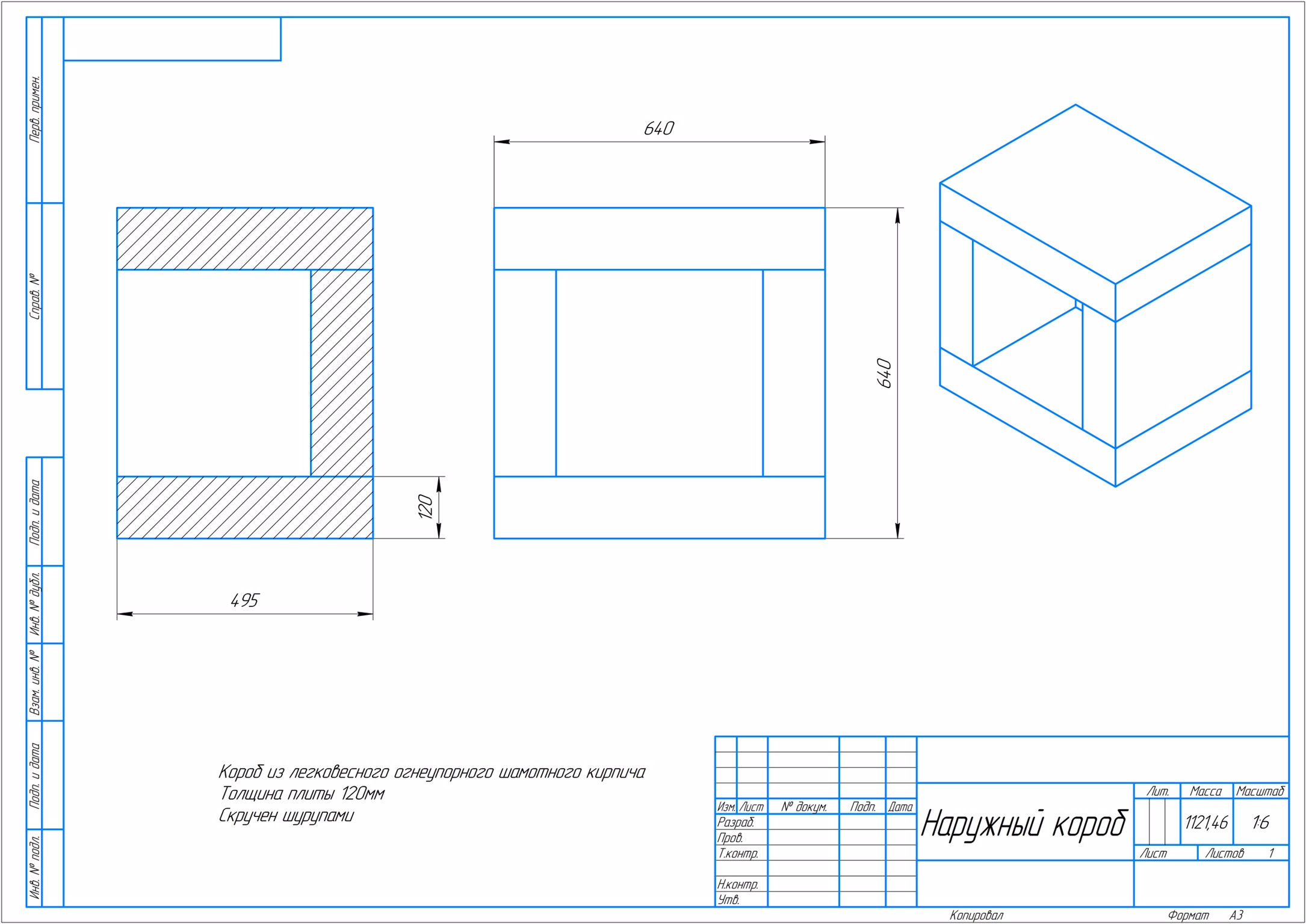 ) состоящую из внутреннего короба (плиты из керамического волокна марки LYTX толщиной 25мм), наружнего короба (плиты из легковесного огнеупорного шамотного кирпича толщиной 125мм), стенки обшиты листом 2мм. Соединения всех плит предполагаю делать не на каком либо растворе, а по притирке друг к другу и скручивания плит между собой саморезами, ибо при большом нагреве может разрушиться раствор. Дно печи сделать из твёрдого огнеупорного кирпича, что бы не раздавить легковес.