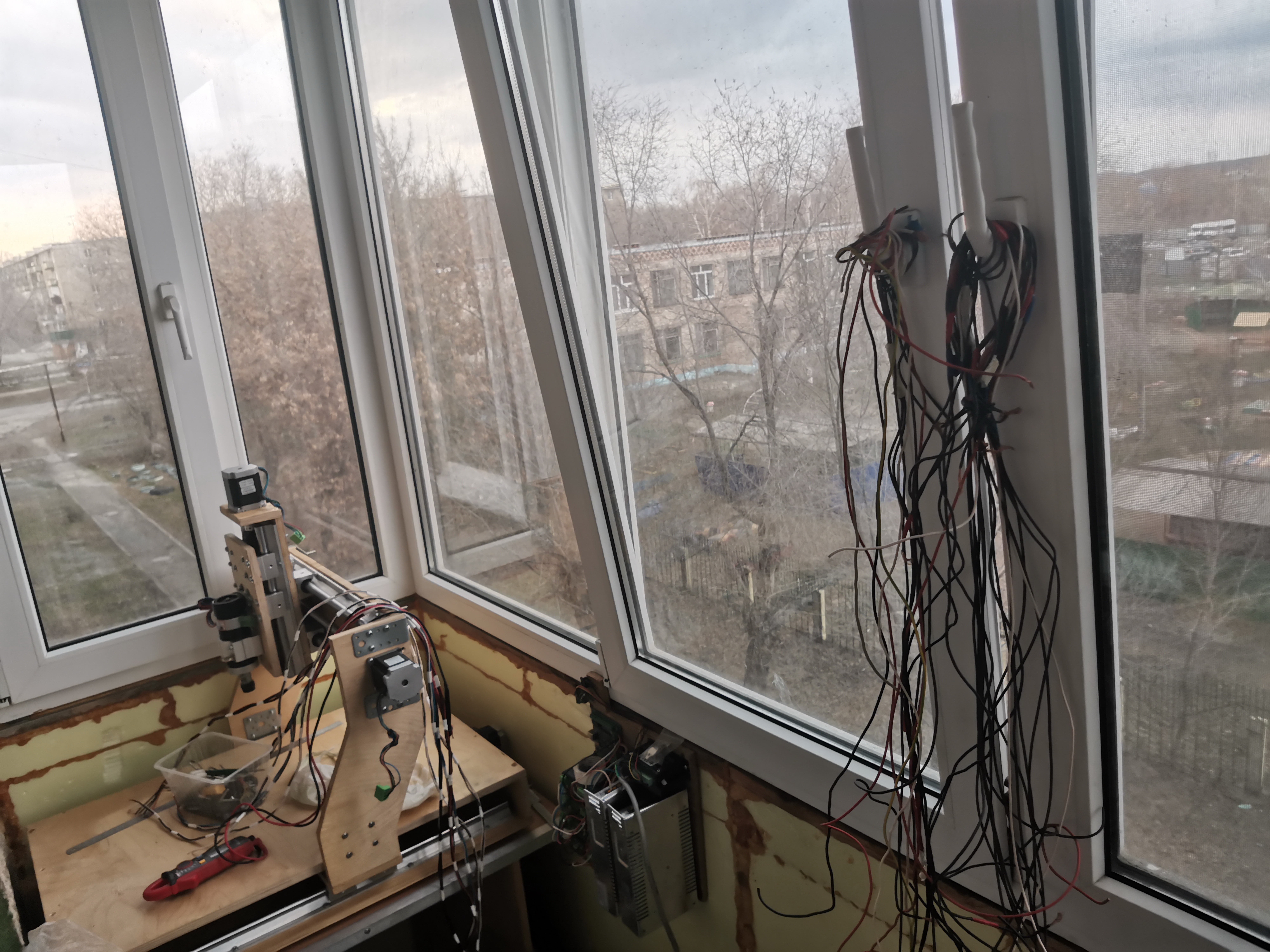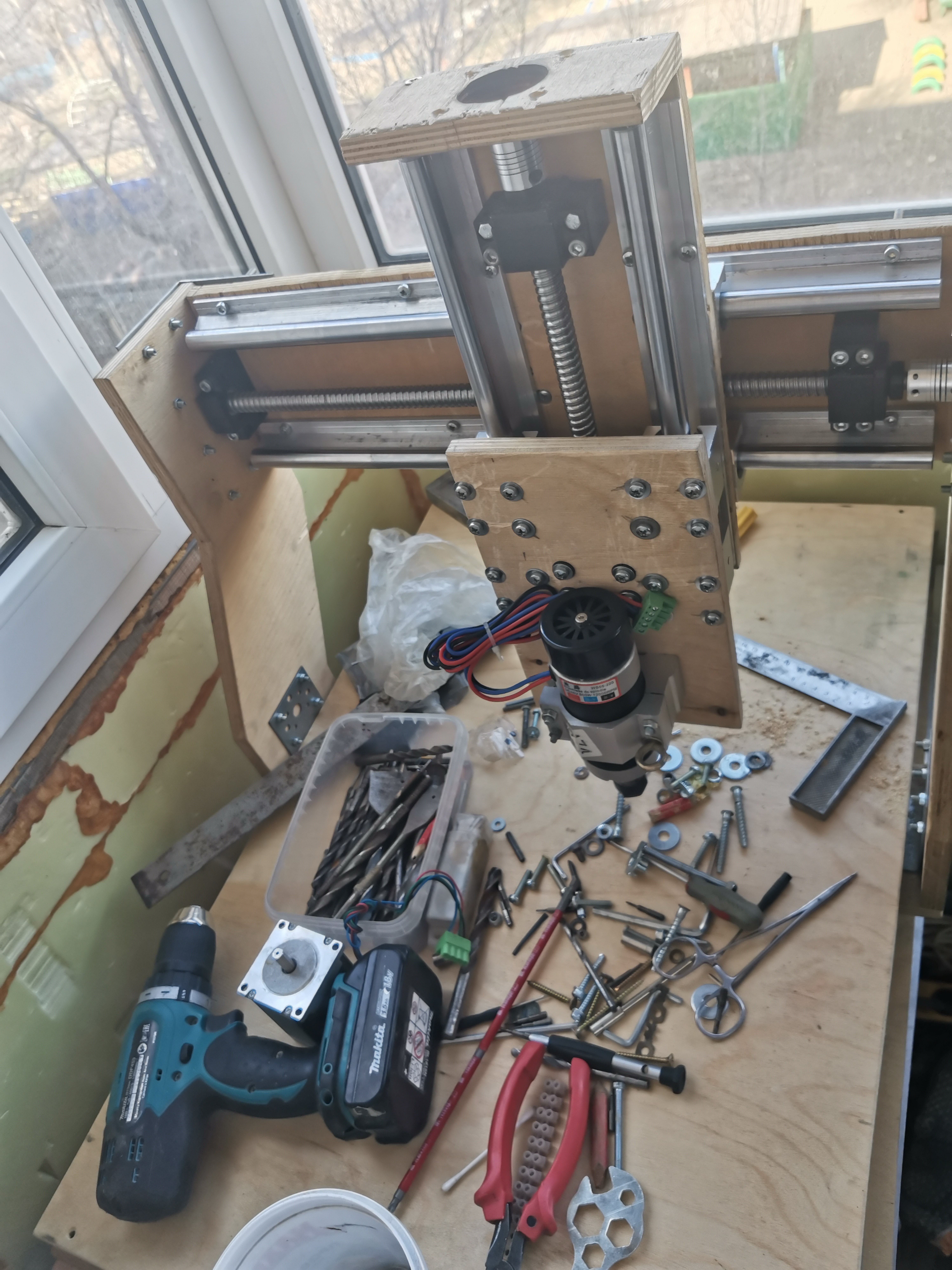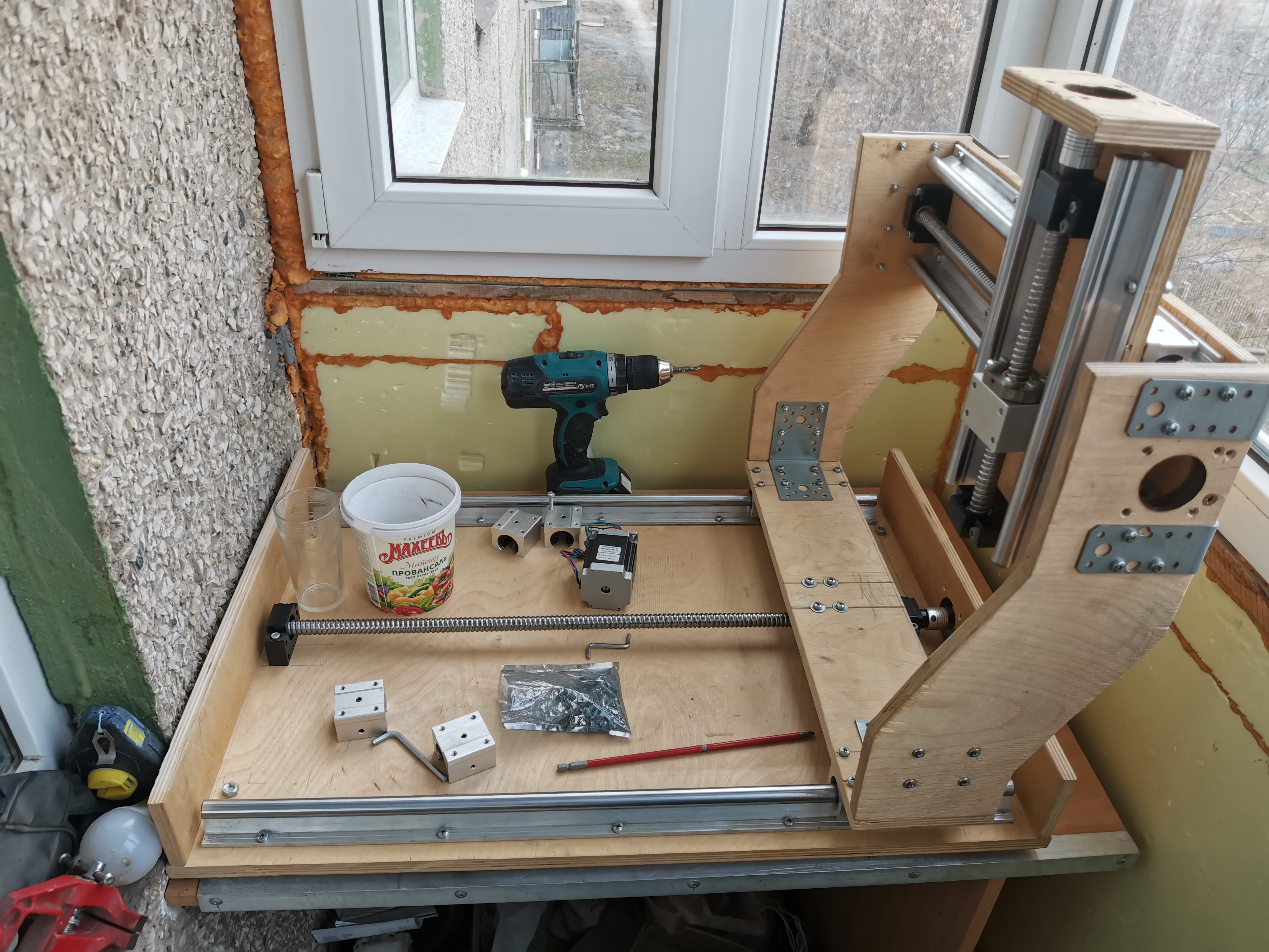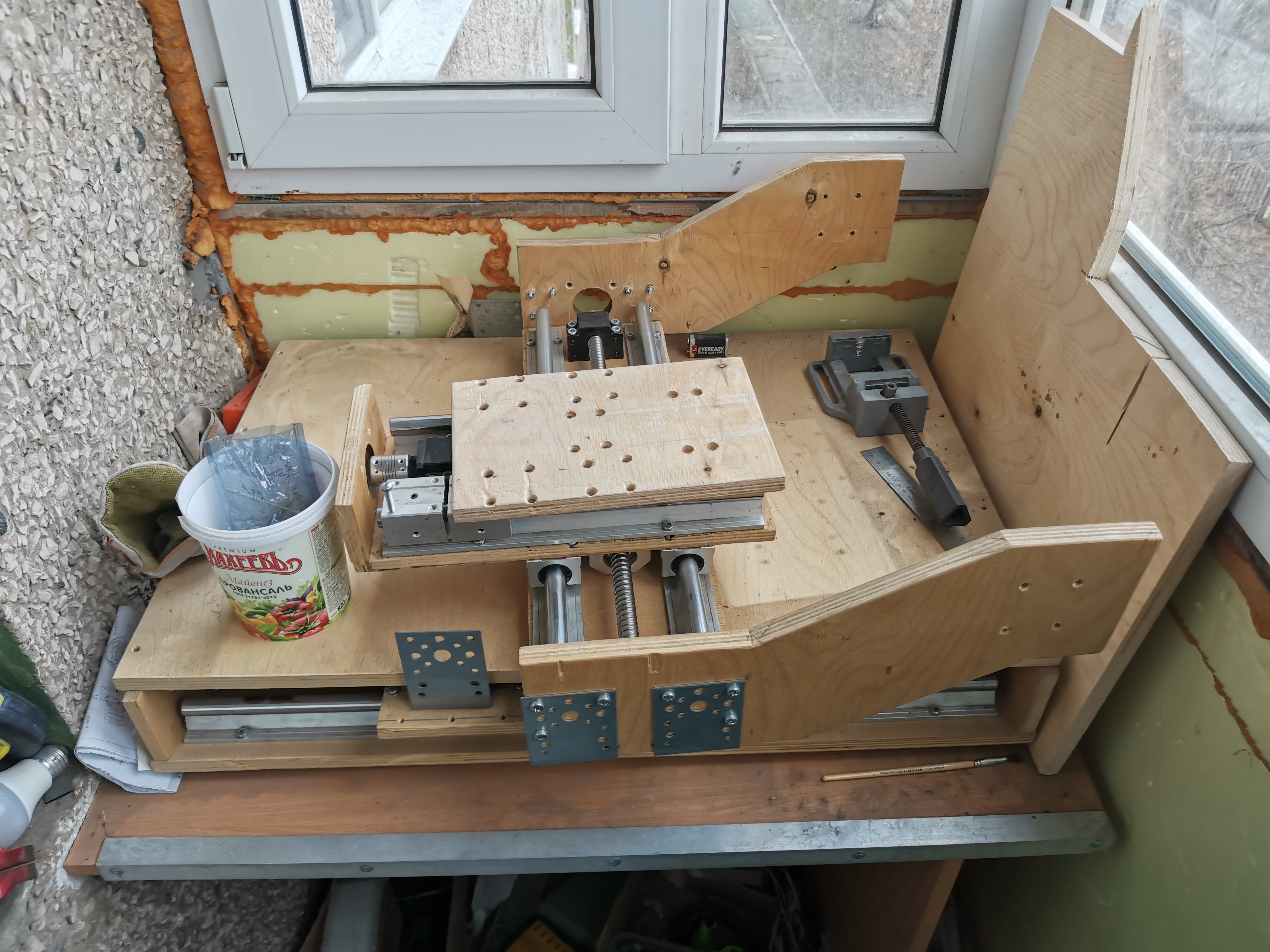 я когда заказывал kit набор было несколько критериев он должен поместится в одном краю маленького балкона и занимать при этом мало места, глубина балкона примерно 850, а рабочую зону изначально хотел 600/400/150, а заказал sbr700/500/300. конструкцию такую собрал на скоряк купил 1.5м/1.5м лист 16мм фанеры и у друга взял ручную циркулярку долго не думая на фанере карандашом на фанере нарисовал выкройки и раскроил,конструкция оказалась не лучшая щас я это понял.немного усилю пока стол и пограюсь пока с таким ,пока буду думать над новой конструкцией