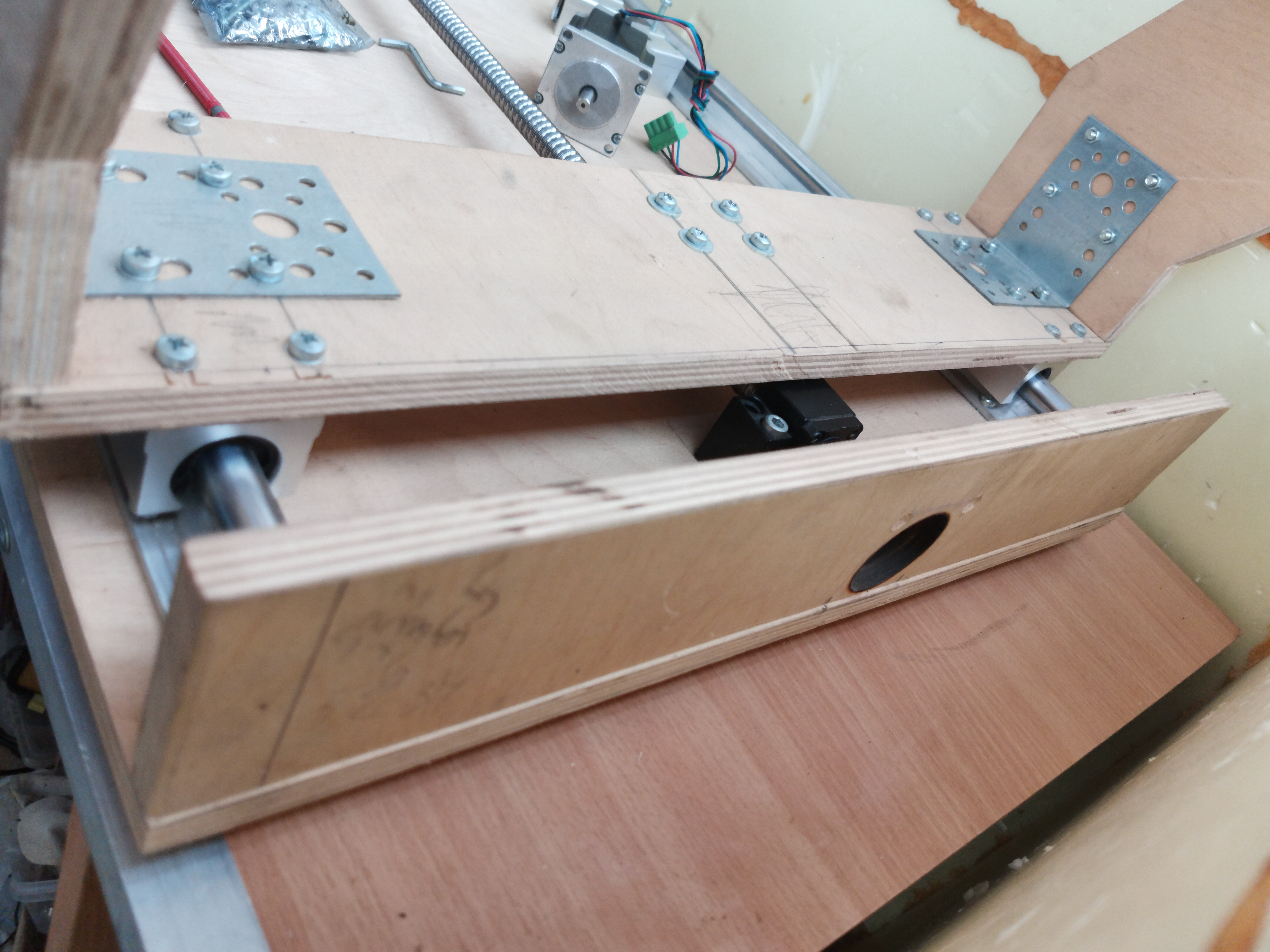 я пересмотрел много конструкций чпу станков мне понравилась конструкция из алюминиевого станочного профиля. типа каркас основание прямоугольной формы из алюминиевого профиля 60/40 по бокам прикрученные рельсы sbr16 это ось ''y'' с верху лист фанеры это столешница и ось основание ''x'' станочный профиль 60/40 сверху и с низу прикрученные к нем sbr16 зеркально.боковины оси ''x'' и вся ось ''z'' из дюралевых плит.многие конструкции такого типа используют на оси ''y'' две швп и два привода я хочу один по середине. я хотел изначально такую конструкцию да и сейчас хочу. по поже как созрею закажу профиль и дюральку.пока думаю что использовать на проставки между станочным профилем60/40 и 16 рельсами какие нибудь алюминиевые полосы или еще что то. было бы лучше если бы не было этих доп углублений в профиле