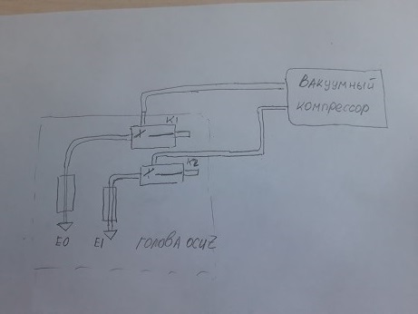 К1,К2 трехходовые клапан. Вакуумный компрессор имеет 2 независимых входа Принцип работы простой. Компрессор со сдает разряжение в трубопроводе и при касании детали она присасывается к головке.
