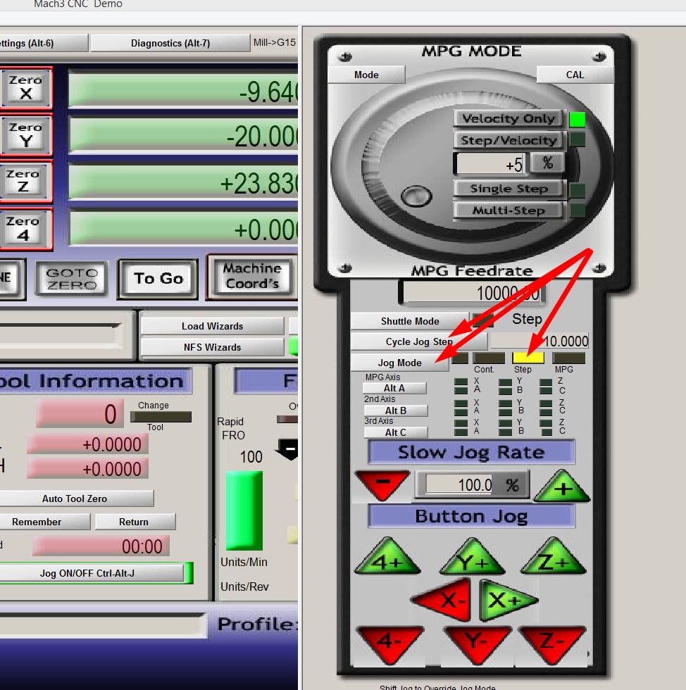 Я имею ввиду перемещение по координате на фиксированную величину: 1 мм, 0.1 мм, о,о1 мм и т.д. , которые задаются в параметрах Config - General Loic Confiuration - Jog Increments in Cicle Mode. В интерфейсе Mach3 это меню вызывается кнопкой Tab на клавиатуре. И там есть кнопки: Cycle Jog Step, которая устанавливает величину перемещения и Jog Mode, которая переключает непрерывное и пошаговое перемещение.