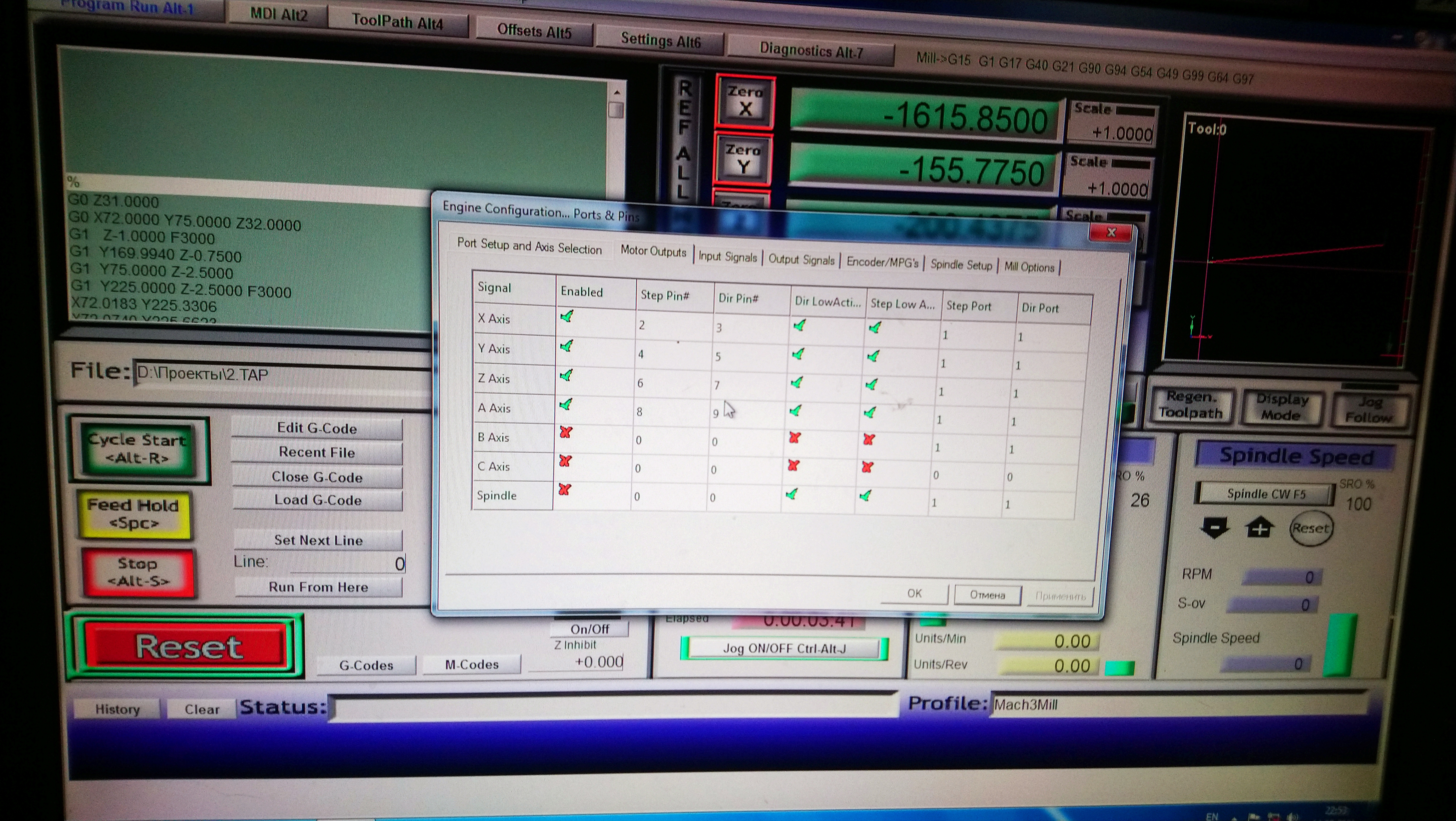 Здравствуйте. Собираю схему пока без станка. Mach3 вроде настроил, с клавиатуры стрелками шаговики крутятся нормально, в домашнюю позицию уходят, как загружаю программу, так топчутся на месте. Типа шаг вперёд - шаг назад. Координаты в маче так же мигают туда-сюда по 25 микрон вроде. В чём может быть проблема?