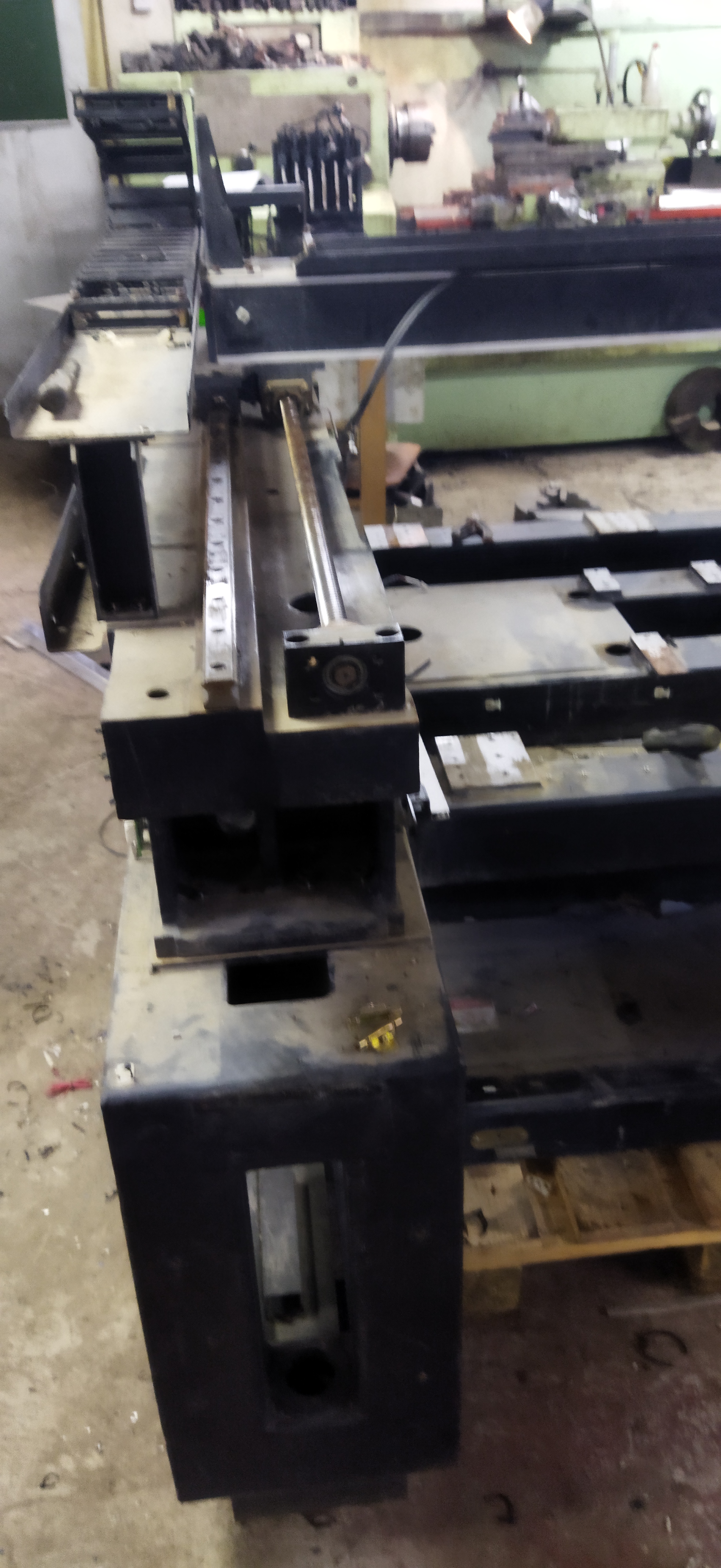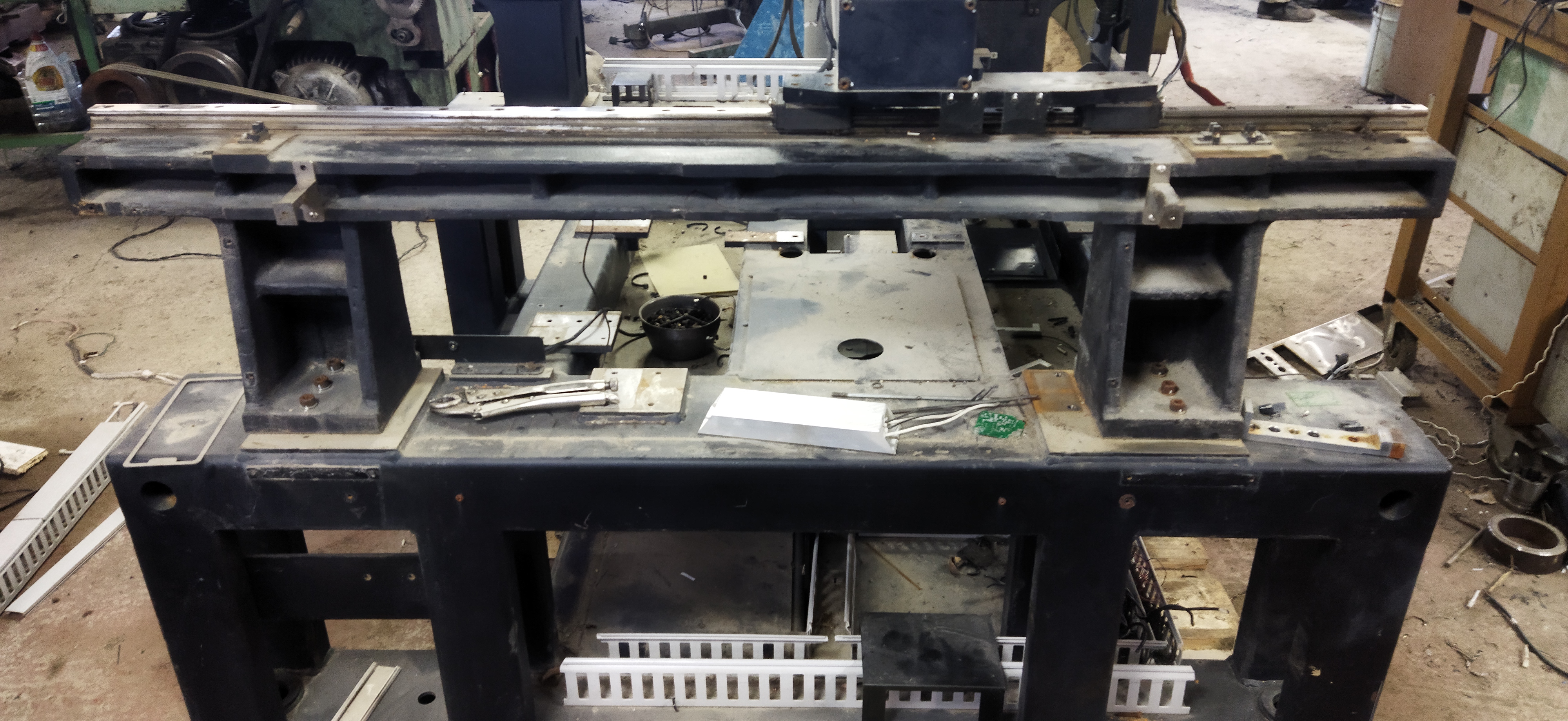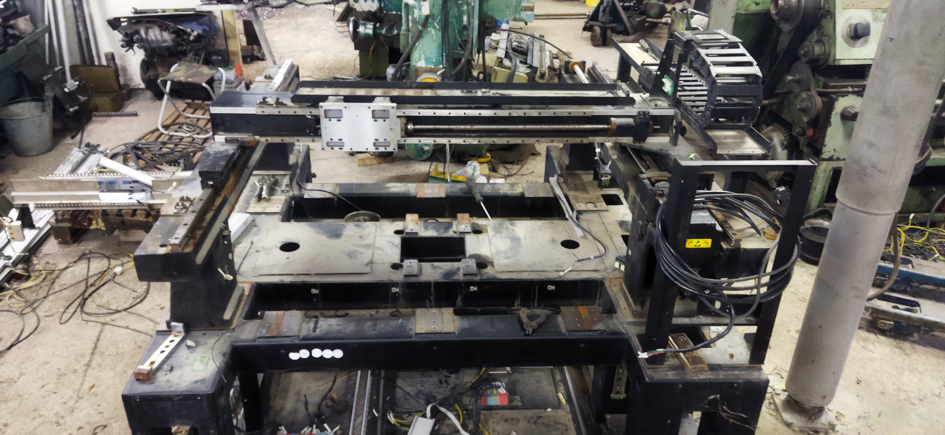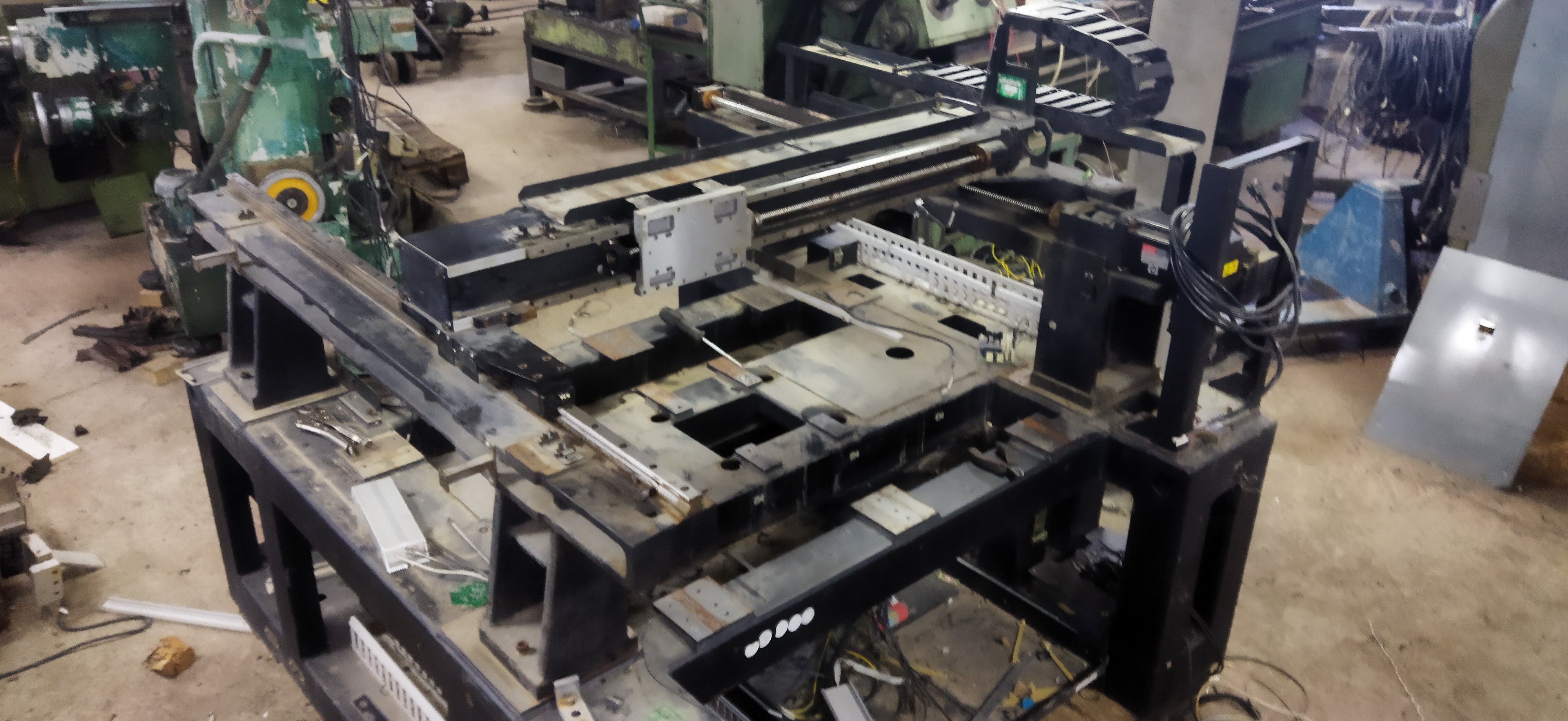 Габаритные размеры 1400х1400, масса около тонны. Основание сварное, довольно жёсткое, чугунные мостики на которых продольные направляющие и аллюминевая балка поперечина. Поле обработки можно вытянуть 1000 х700 примерно. На продольных стоят 25 рельсы ТНК и ШВП с одной стороны.