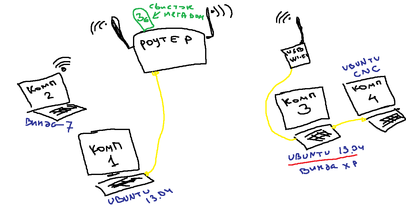 Третий тоже работает и получает интернет. А вот четвертый на котором стоит EMC не хочет подключаться к третьему, если на нем загружена винда. С линуксом конектится, интернет получает, разшары видит.