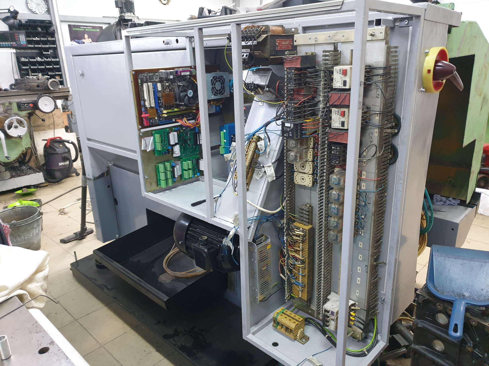 Что сделано. Станок отмыт, покрашен. Далее отказался от гигантского родного электрошкафа и сделал новый за станком, места у меня в цехе не так много. Часть электрики отвечающей за выбор передач, масло станцию, револьверку, сож и прочее перенес с родного шкафа проведя профилактику.