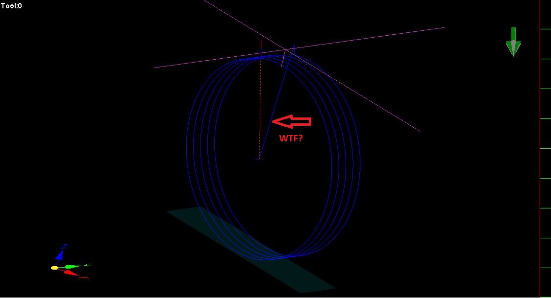А сначала вообще Mach3 рисовал странную траекторию, пока я не закомментировал в начале УП строку "(G0 G53 X0 Y0 A0)"