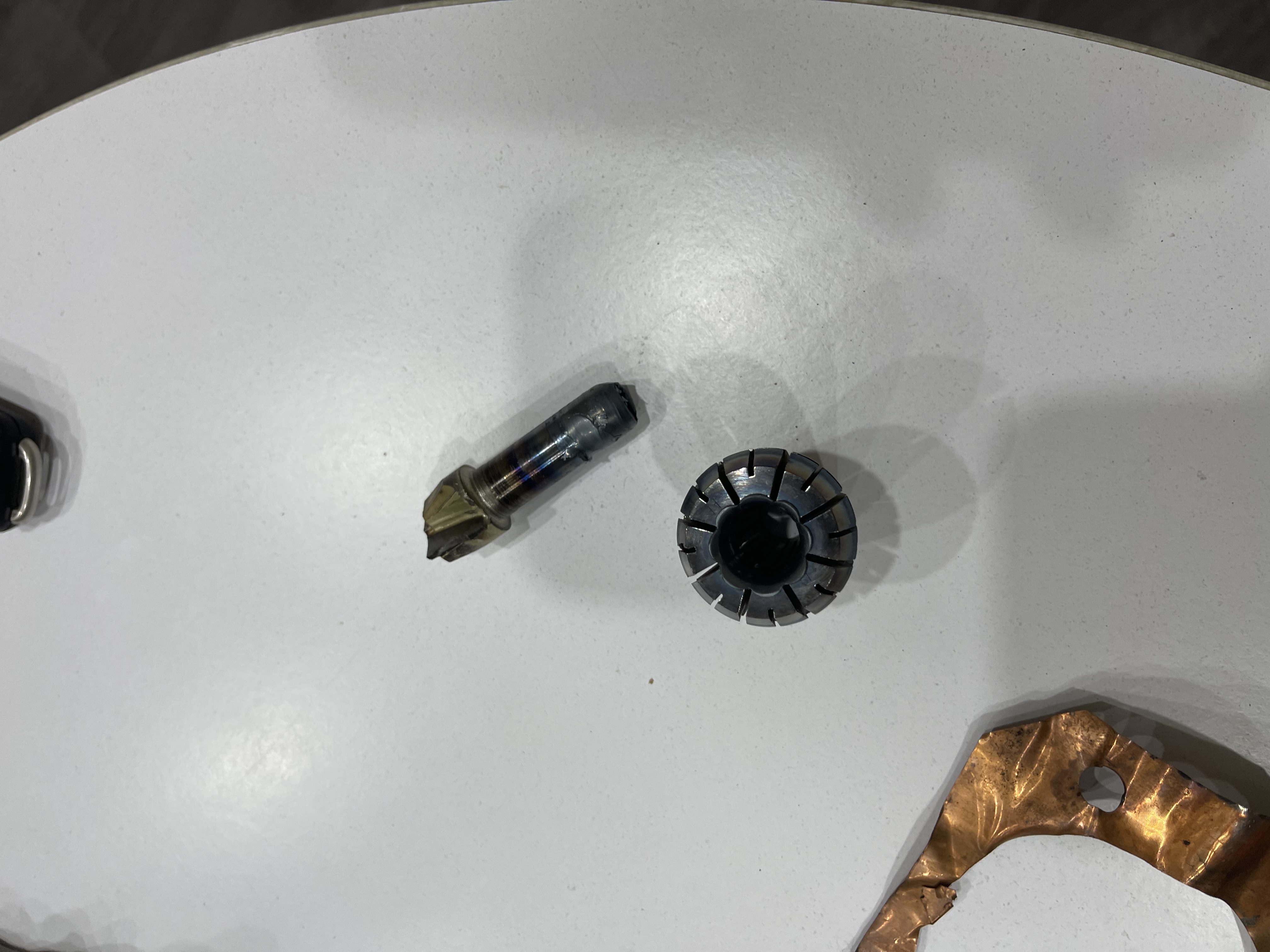 Скорее всего станок потерял позицию, увеличилась подача на зуб так, что аж твердосплавные напайки выкрошились, резание кончилось, там уже провернуло, завертело в цанге, дальше станок докатился до отбойников, а концевики похоже не на отключение питалова приводов заведены, а в управляющий софт...поэтому наверное надо будет винт/гайку/рейку ещё посмотреть.