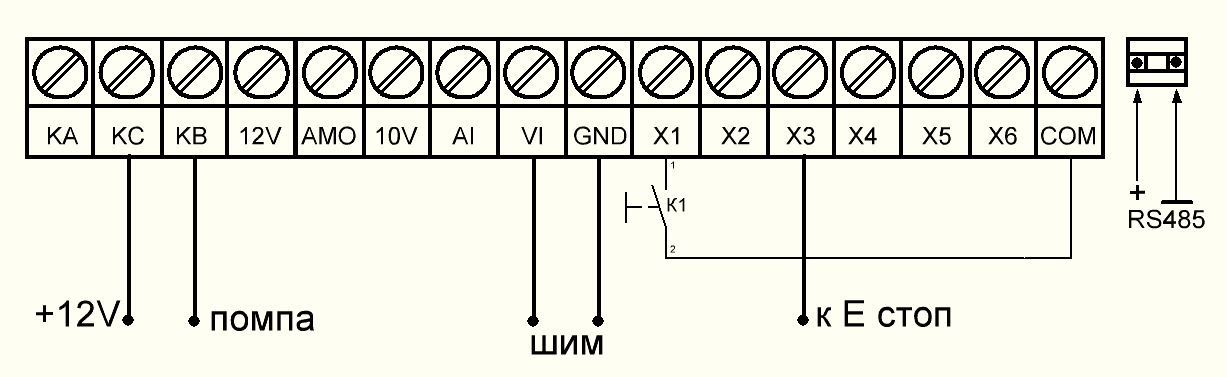 Переключатель на 3 положения с фиксацией. При подачи сигнала на Х3 он снижает обороты, у меня подключена кнопка стоп на Х3 СОМ соединен на прямую. Нажимаем кнопку стоп сигнал поступает на Х3. Сигнал Е стоп поступает в МАЧ реле отключает Х1 должна произойти остановка шпинделя. А шпиндель продолжает вращаться на минимальных оборотах.