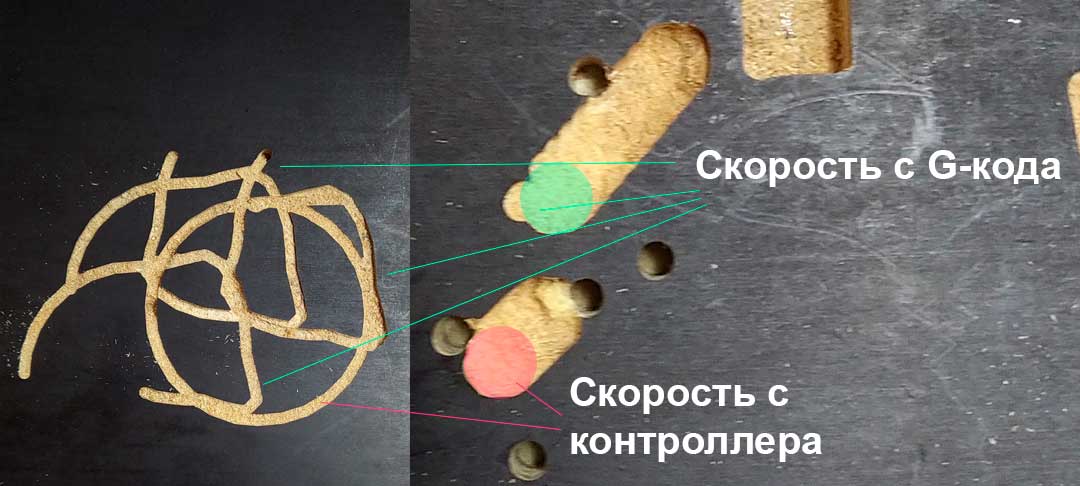 При фрезеровке например круг диаметром 60 мм он фрезерует в настройках контроллера (розовым) ровно, но если переключить на G-код (зеленым) то начинается какая-то херня. А если фрезеровать кружки диаметром 8 мм то с каждым проходом фрезер смещается по диагонали, в настройках контроллера чуть чуть, а если брать настройки скорости с G-кода тогда прям в сильно дальше улетает соответственно смещается и нулевая точка. Подскажите куда копать? люфтов нет, ошибка повторяемая, фрезеровал по 1 мм, так что не в жёсткости станка дело. Подозреваю что всё дело в скорости и ускорениях? в шаге деления? в отсутствии редукторов на ШД?