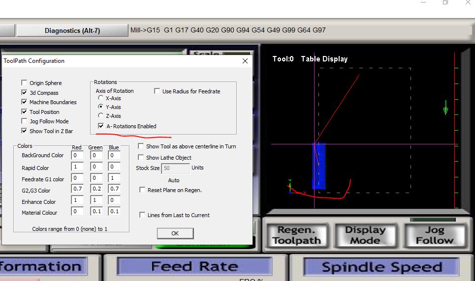 Обратил внимание, что данная проблема проявляется когда в настройках Mach - Config - ToolPath стоит галочка A-Rotations Enabled