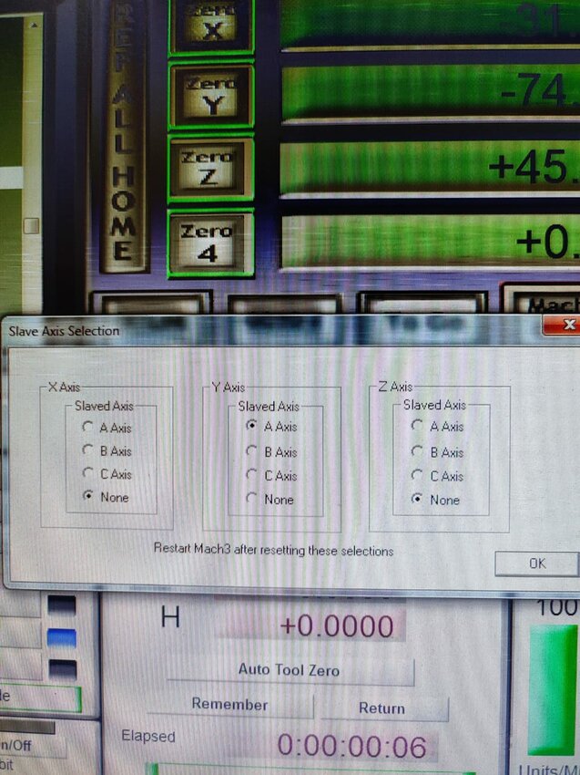 Всем доброго дня, такая проблема: Станок с двумя двигателями по оси Y. В Mach3 настроил ось A в подчиненном режиме к оси Y. Настроил так, чтобы оси Y и A калибровались независимо друг от друга по своим датчикам. Все работает нормально, пока в G-коде нет отрицательных значений оси Y. При отрицательных значениях ось Y работает правильно, но ось A останавливается на нуле. Например, имеется строчка y10, а следующая строчка y-10. Ось Y пройдет все расстояние в 20 мм, но ось A пройдет только 10 мм и остановится на Y0, что приведет к перекосу портала. При ручном перемещении проблемы нет, проблема возникает только при выполнении G-кода. Так же если выключить Soft Limits проблема исчезает. Подскажите пожалуйста в чем может быть дело? Основные настройки прикрепил, если нужно еще что то - скину. Буду очень благодарен за любые идеи.