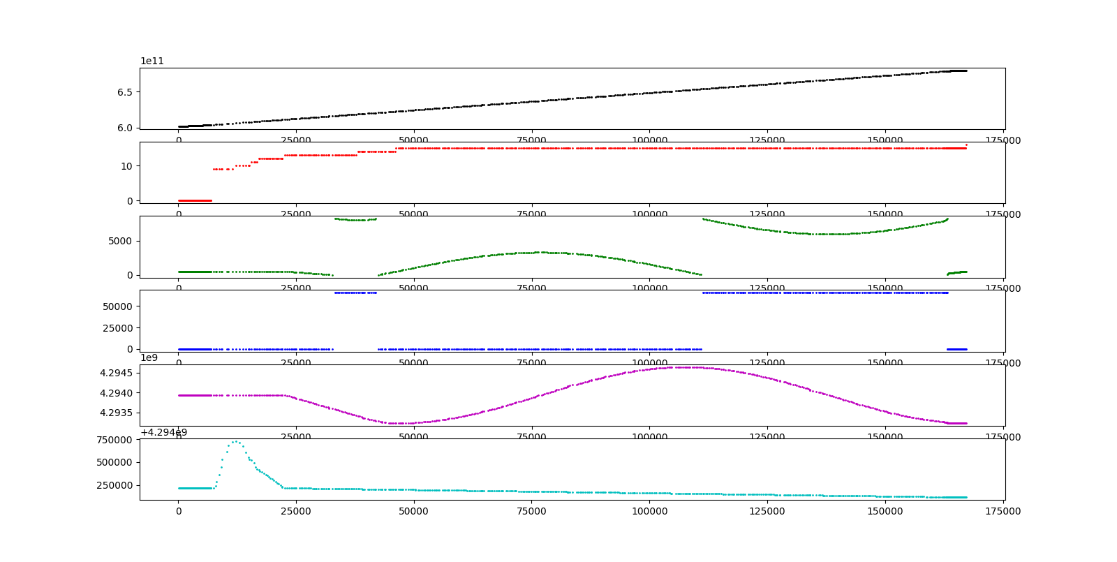 Ниже приведена диаграмма одного из сэмплов, снятого мной траффика. На верхнем графике - временнЫе метки пакета, которые контроллер мог бы использовать для синхронизации генерируемых импульсов с предназначенным для них временем срабатывания.