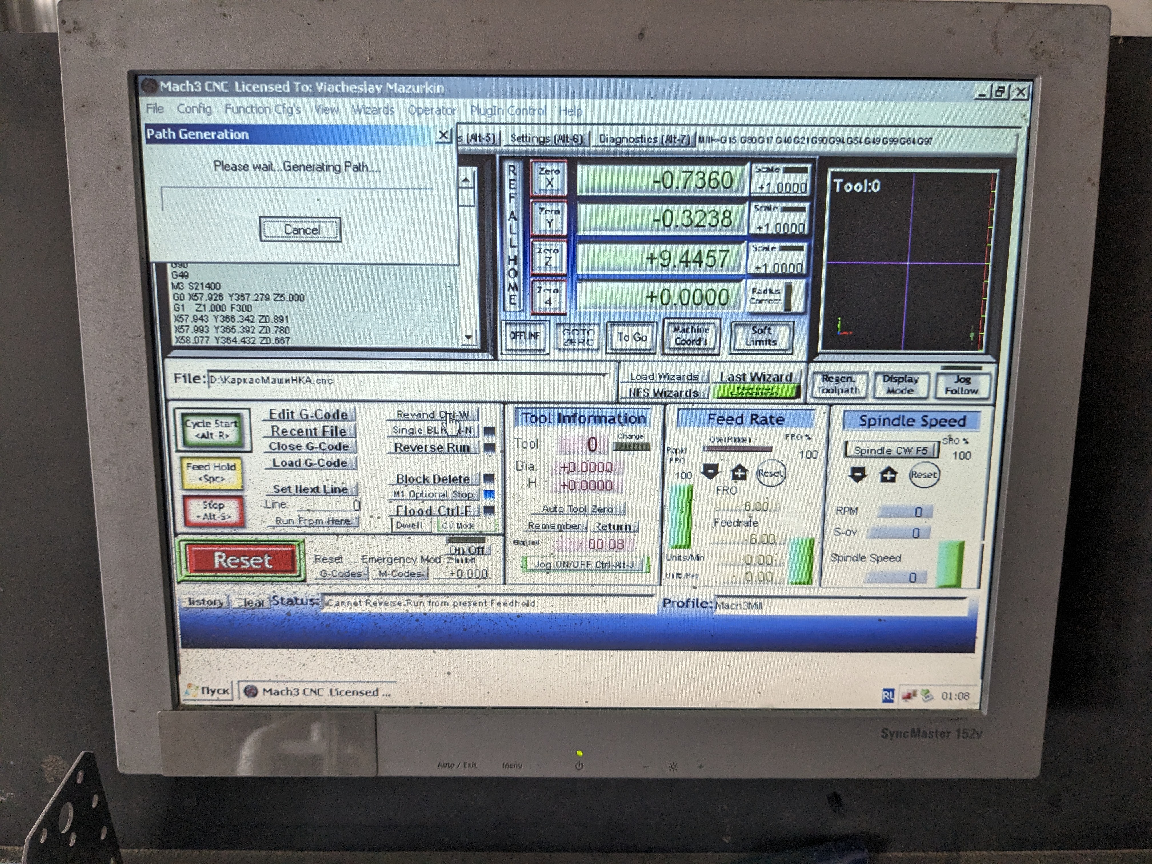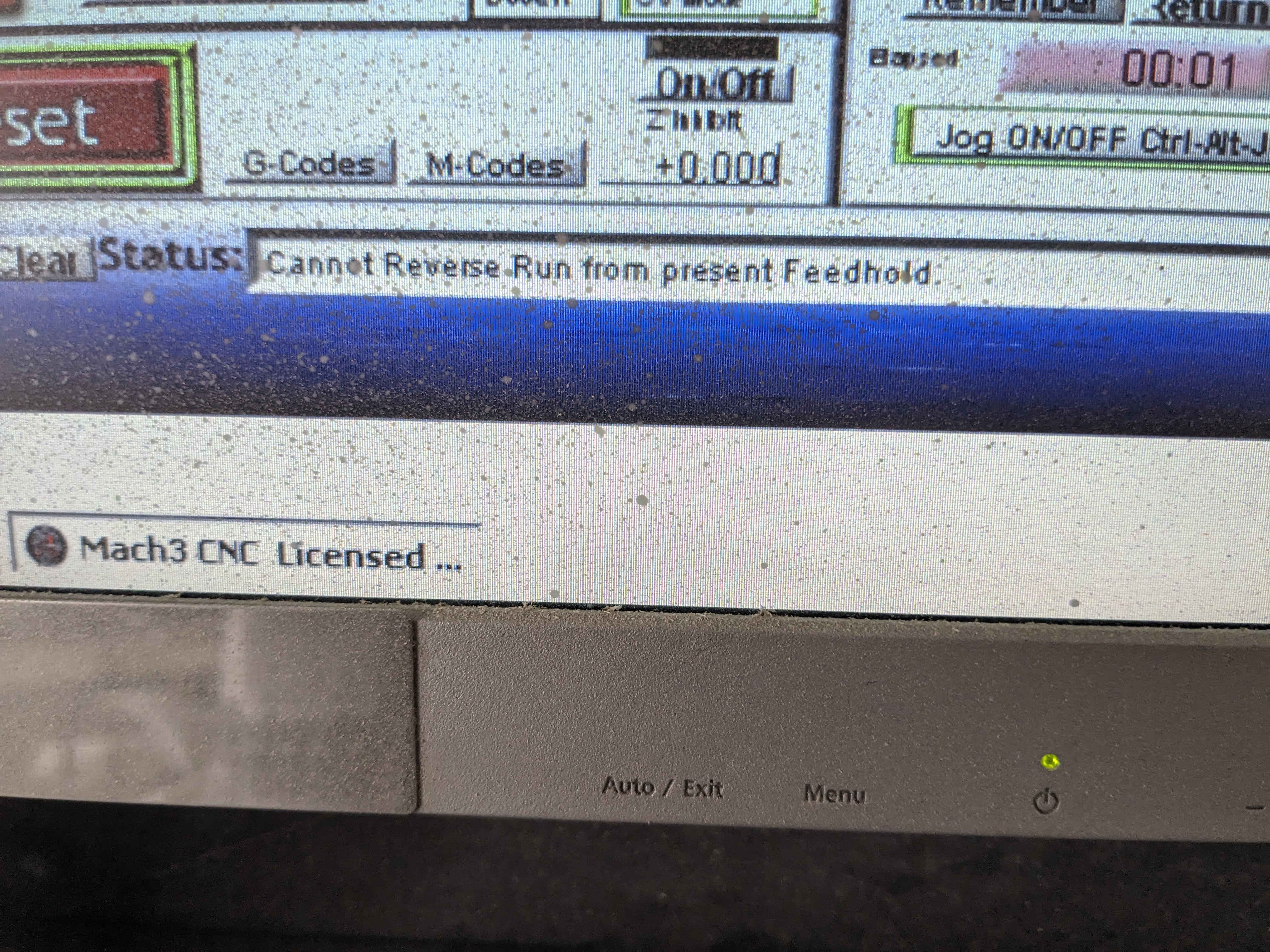 Столкнулся с такой проблемой, не пользовался станком около 2-х месяцев, подготовил простую программу раскроя фанеры. Загрузил g-code mach3, а когда запустил программу, mach3 выдал ошибку "cannet reverse run from present feedhold". Программы перестали запускаться.