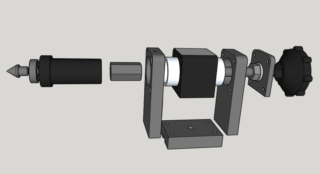 Сделал заднюю бабку. Маховик и центральная вставка напечатаны на 3Д принтере, пиноль тоже временно напечатал ( с токарями у нас в городе проблема). По размерам ширина 50 , длина 75 , высота центра 92