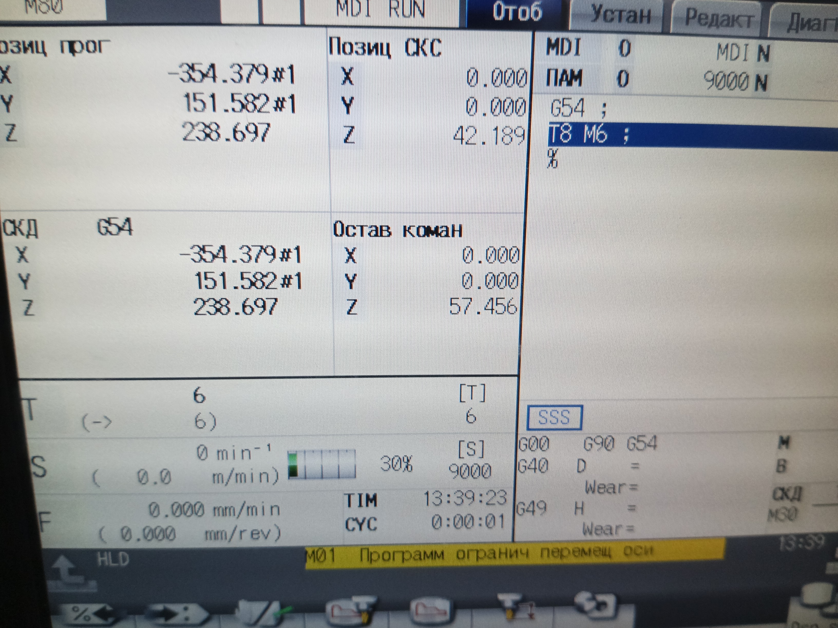 Добрый день. Помогите разобраться с проблемой на станке под управлением Mitsubishi M80. Проблема заключается в том, что при смене инструмента стойка падает в аварию (М01 программное ограничение перемещения 0007 Z). В MDI заказываем сменить инструмент один, два раза меняет, на следующий раз ошибка. Иногда при пуске смены инструмента останавливается, и в окне оставшиеся команды пишет значение 13.845, хотя сами оси находятся в нулях.