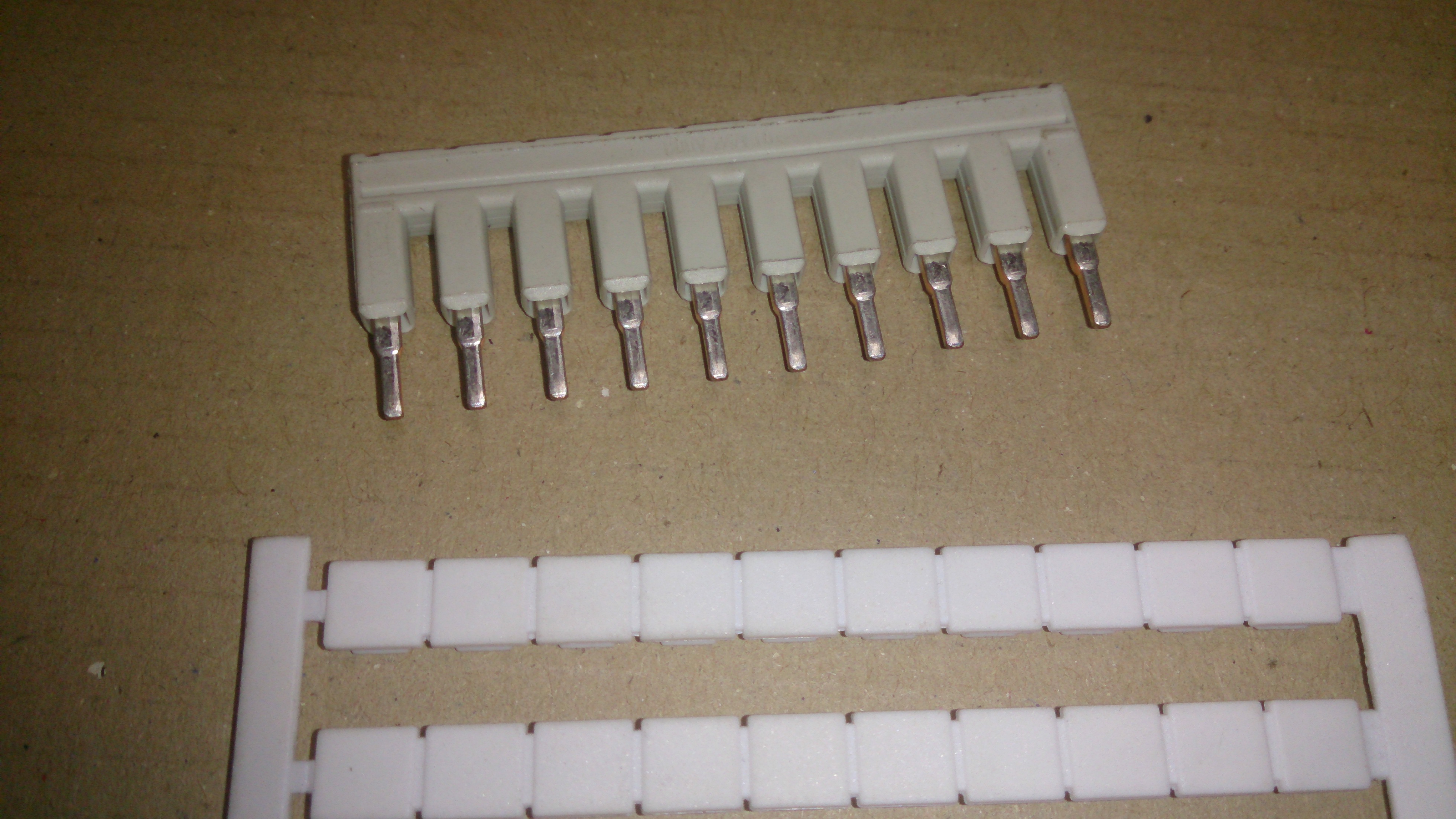 перемычка. ей можно собрать ряд клеммников в шину, удобно, когда раздаешь питание, ноль, или 485-шину. если что - ногу в середине гребенки можно выкусить, а сверху маркером обозначить, где контакт в шине, а где нет.