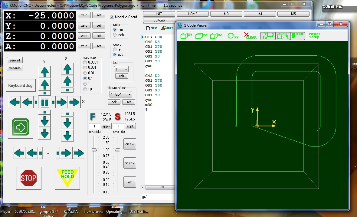 совсем недавно начал осваивать фрезерный станок; столкнулся с проблемой, как в Mach 3 включить компенсацию диаметра инструмента? насколько я понял, для этого существуют команды: G40 - для отключения компенсации , G41 - для компенсации типа "карман", G42 - для компенсации типа "остров". опять же, как я понял, в каждой строке писать G41 или G42 необязательно, достаточно написать один раз,а в конце выключить. хочу сделать прямоугольник, например. пишу так: