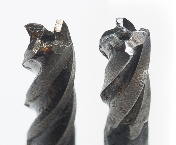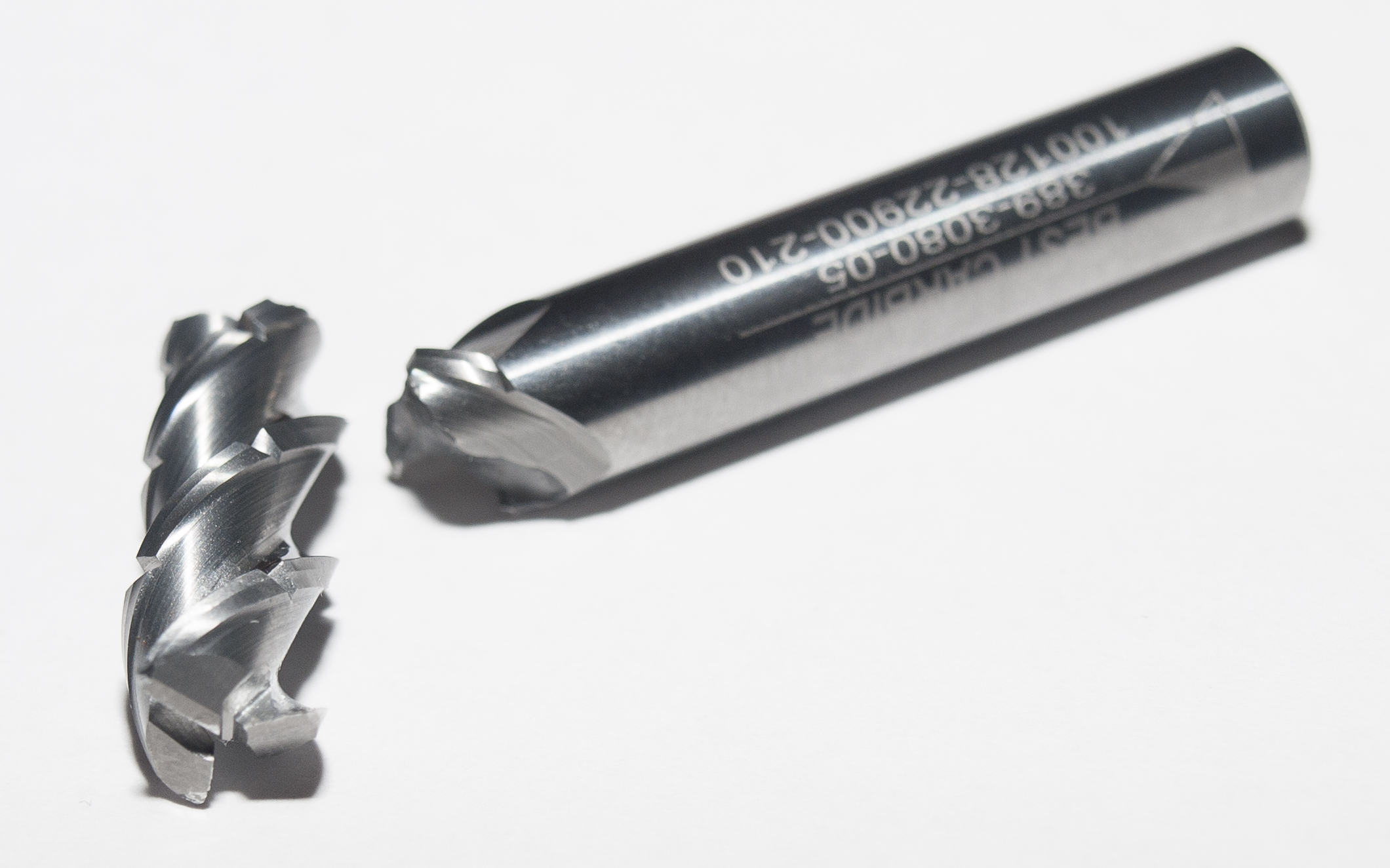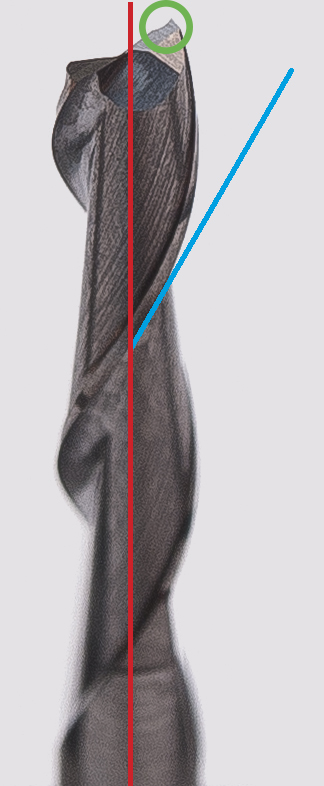 Все эти фрезы имеют схожее строение: 2 пера, угол подъема винтовой канавки 30 градусов, все фрезы имеют плоский врезной торец. Но на фото видно, что Best имеет значительно меньшую стружечную канавку. С одной стороны прочность фрезы возрастает и казалось бы можно давать большую подачу, но поскольку места отвода стружки меньше мы при тех же режимах, что и на Kyocera получали залипание канавки и как следствие поломку фрезы (с Kyocerа такого не было ниразу, а у Best 3 из 5 погибли именно так особенно при засверливании, в итоге только истраченное время). Зуб, при острие кромки имеет вспомогательную канавку, для создания более острого угла (зеленый кружок). Если Сравнивать зону зеленого кружка на всех фрезах, можно увидеть, что Best имеет наименьшую, а на 4й и 5й явно видно отсутствие его ввиду износа (чем-то напоминает фрезу номер 1). Потому рекомендуют использование фрез с радиусным углом, поскольку они меньше подвержены износу. Немного об угле подъема винтовой канавки: