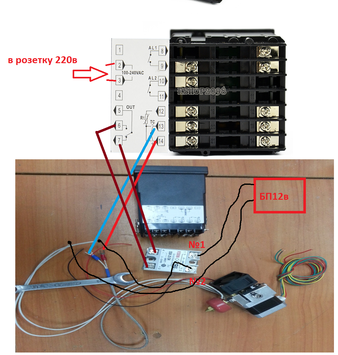 2. подключаешь термопару (красный/зеленый выводы) включаешь терморегулятор должна показывать температура более менее правильно. Если нет то лезишь в настройки и выбираешь тип термопары (нужно найти мануал на термоконтроллер)