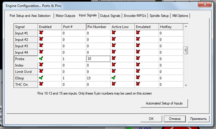 А дальше подключаете купленный датчик, либо самодельный (два проводка, крокодильчик, кусочек фольгированного текстолита) к соответствующим разъёмам на Вашей плате, в программе устанавливаете номер подключенного пина (Probe см.картинки), вставляете необходимый скрипт в программу на соответствующую кнопку (для Mach3), в скрипте задаёте толщину пластины (текстолита или того, что купите) и пользуетесь.