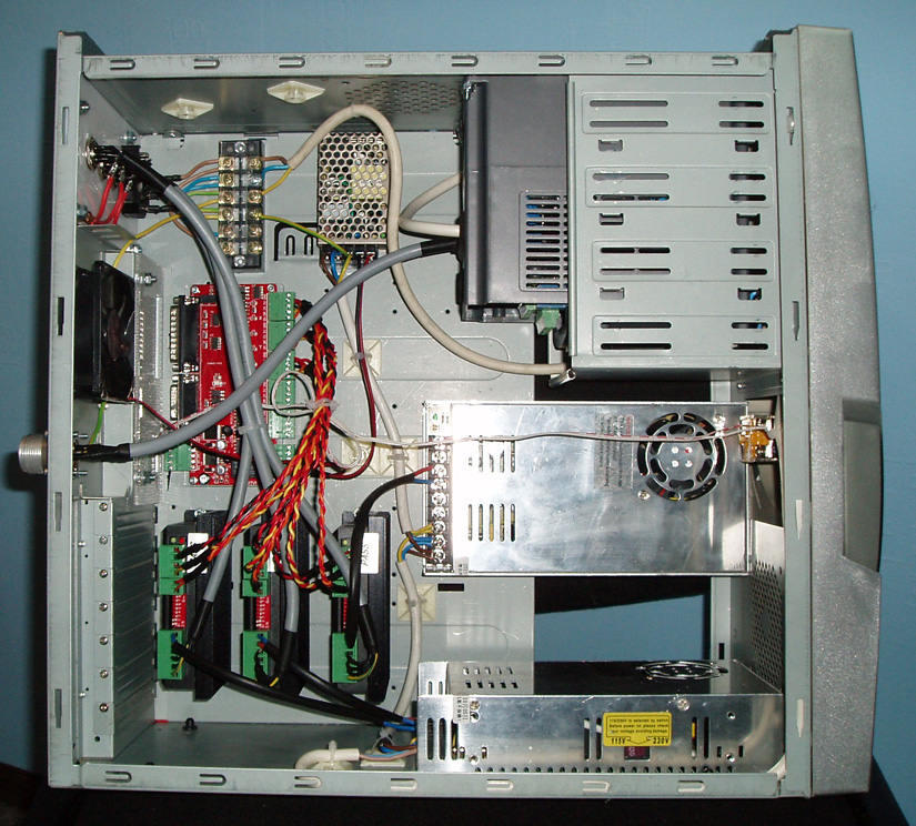 В системном блоке от компьютера разместил два блока питания двигателей, маленький блок питания логики, частотник, драйвера.
