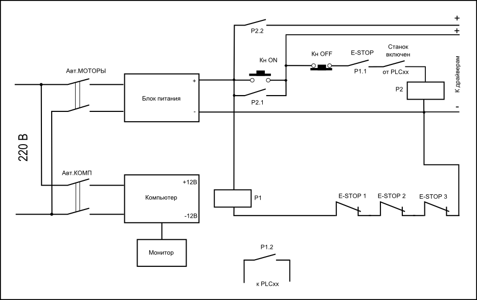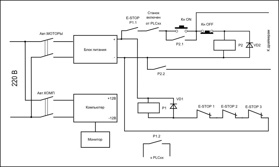 драйверы включаются ТОЛЬКО при включении компа, загрузки ПО и включении станка в ПО, замкнутых контактах Е-СТОПов и нажатии кнопки "СТАНОК ВКЛЮЧИТЬ". Драйверы отключаются от питания при срабатывании любого из перечисленных сигналов. Также станок будет видеть аварийный режим при отключении питания драйверов по вине БП или отключении автомата питания станка.