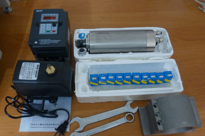Продам полный комплект Шпиндель 1.5 Kw с водяным охлаждением, частотный преобразователь BEST, полный набор цанг ER-16, насос для замкнутой циркуляции воды, зажимной хомут для установки шпинделя, за все прошу 20000 рублей.