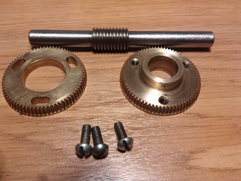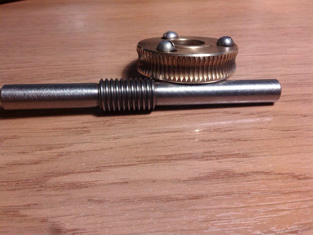 Червячная пара с возможностью выборки мертвого хода. Ведущий червяк - сталь 45, диаметр хвостовиков 8мм. Ведомая шестерня - бронза диаметр 40.3 мм, диаметр отверстия 14мм, кол-во зубьев 72, модуль зуба 1.75, один поворот червяка = повороту 5 градусов ведомой шестерни.