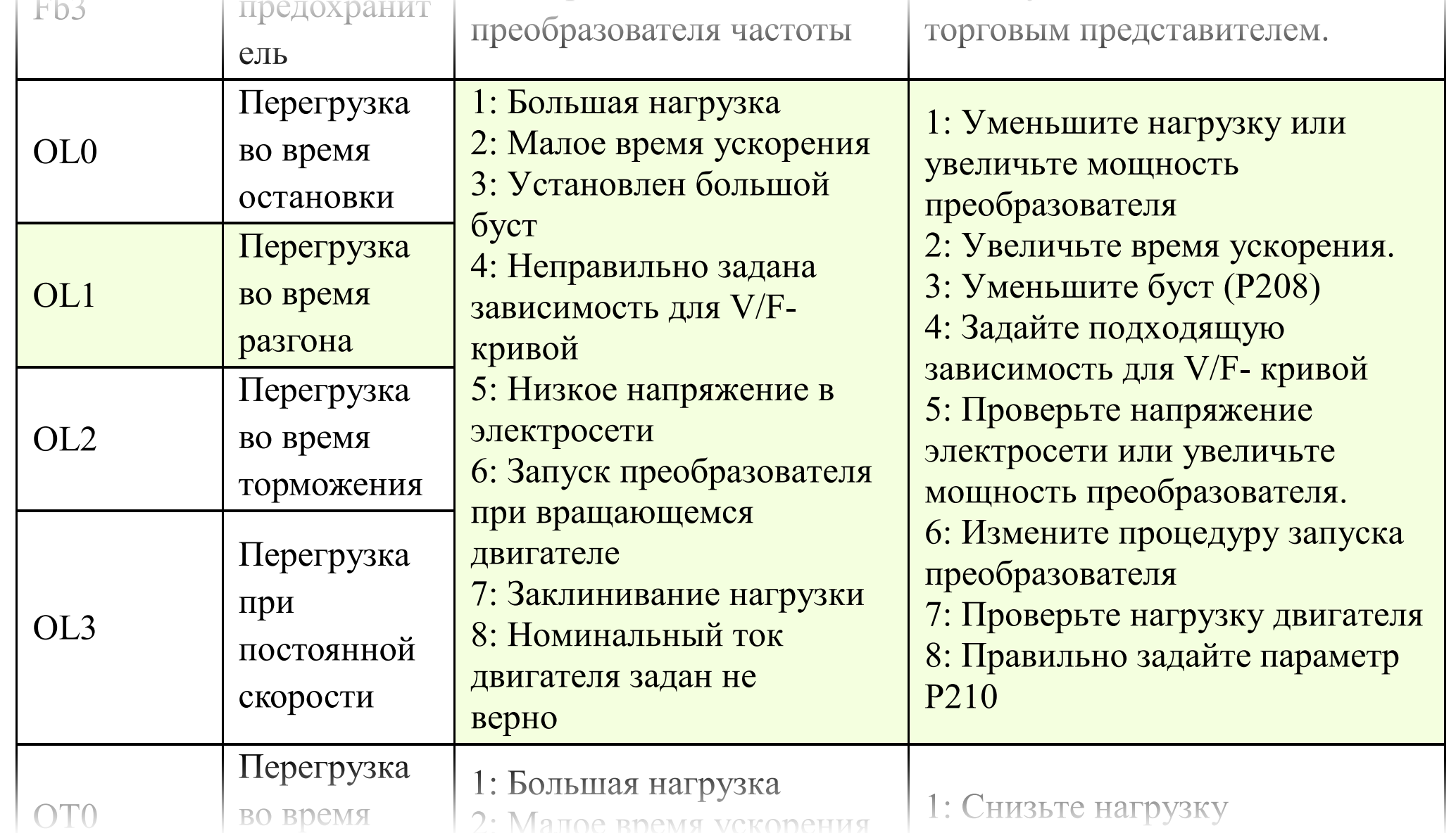 Детали последней ошибки, включая задание частоты, фактическую выходную частоту,