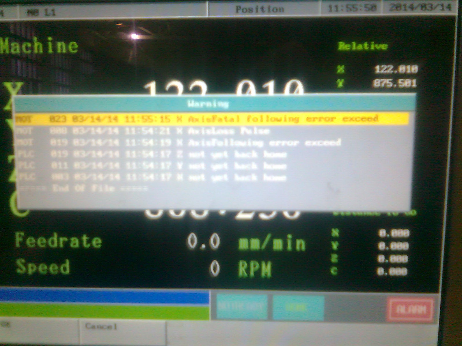 А вообще проблема заключается в следующем: имеется фрезерный китайский станок, для обработки древесины Beaver-25. При запуске станка его оси должны перейти в "ноль". В "ноль" оси переходят за счет концевиков, установленных на осях. Все концевики в рабочем состоянии. Однако в "ноль" он не переходит. При ручном управлении с панели, ось Х или У перемещается примерно на 1 см, вместо того чтобы переместится до концевика. После того как ось Х или У переместится на 1 см, на панели выводится критическая ошибка одной из осей(фото ниже). Эта ошибка сбрасывается только путем перезагрузки (выключения питания) шкафа управления. Однако ось Z вообще отказывается перемещатся ни на сантиметр. Вот, вроде все рассказал.