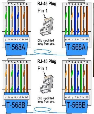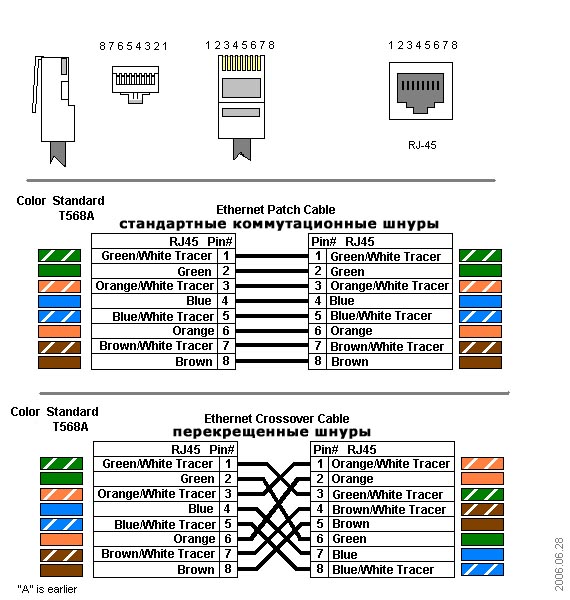 В стандартах 10Base-T и 100Base-T используются только две пары - контакты 1,2 и 3,6. Соотв. прямой патчкорд - это 1-1, 2-2, 3-3, 6-6, а перекрёстный - 1-3, 2-6, 3-1, 6-2. Карты/комутаторы,работающие в этих стандартах могут иметь разные порты, а именно: MDI (прямой, как правило комп), MDIX (перекрещенный, как правило комутатор) и AutoMDI (ну эт понятно). Прямым кабелем соединяются порты MDI с MDIX. Перекрещенным можно соединять MDI с MDI и MDIX c MDIX. AutoMDI можно соединять с любым из трёх типов портов любым кабелем.