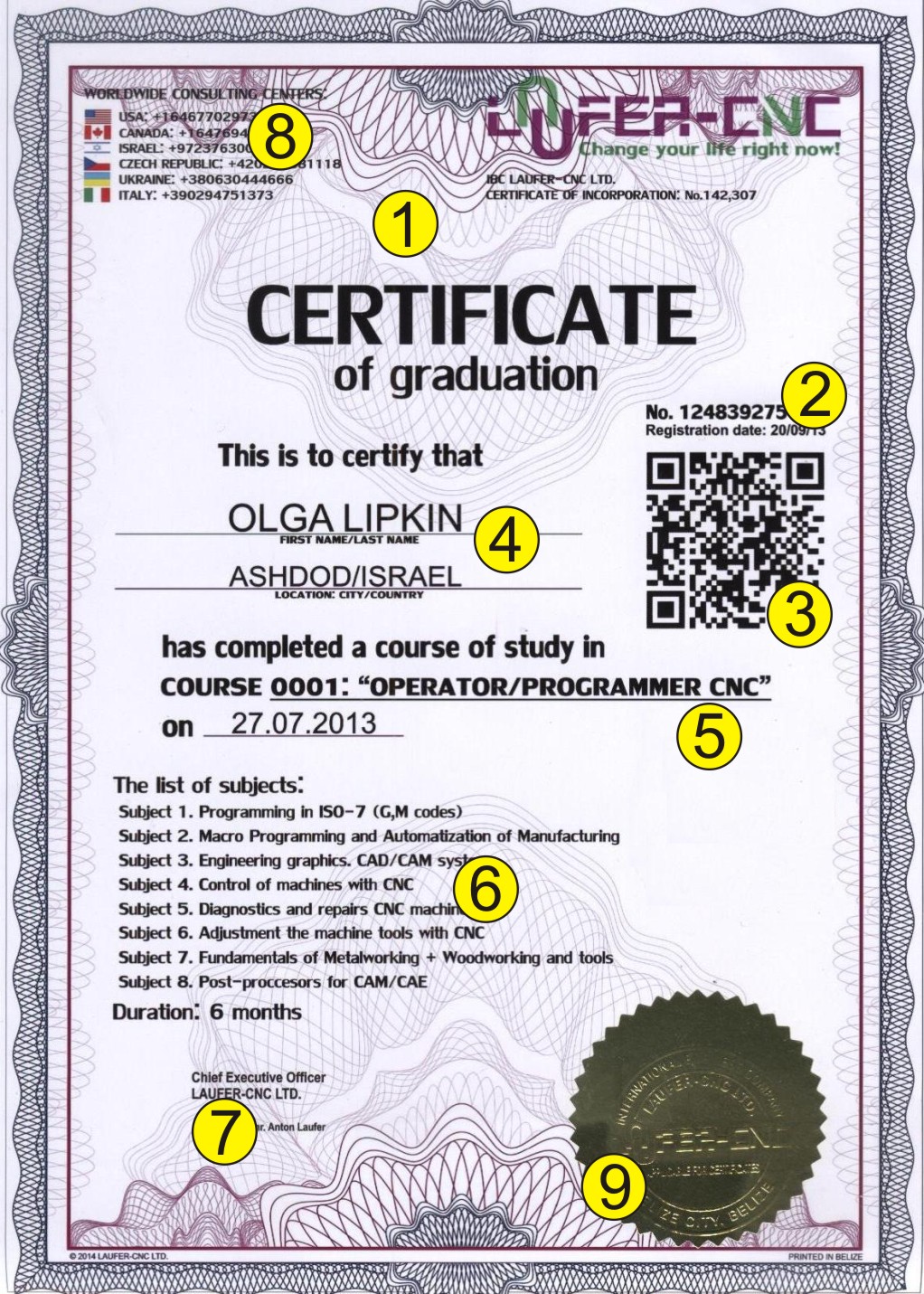 8. Мы не держим информацию об слушателе курса в тайне. Если Вы являетесь работодателем, и Вас интересует действительно ли данный сертификат принадлежит следующему наемному рабочему, Вы можете обратиться по телефону в один из наших консультационных центров, телефоны которых находятся в нижней части сертификата.