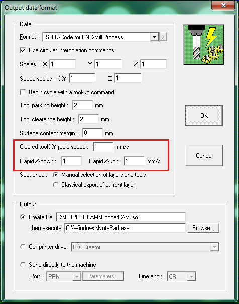 Скорость настраивается в в меню "Output data format", в меню "Active Tool" (Parameters/Selected tools...) и в "Tool Library: