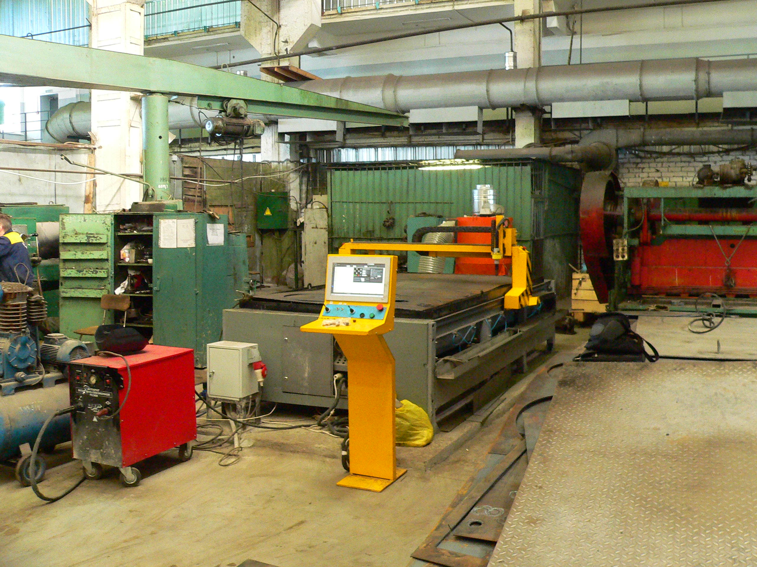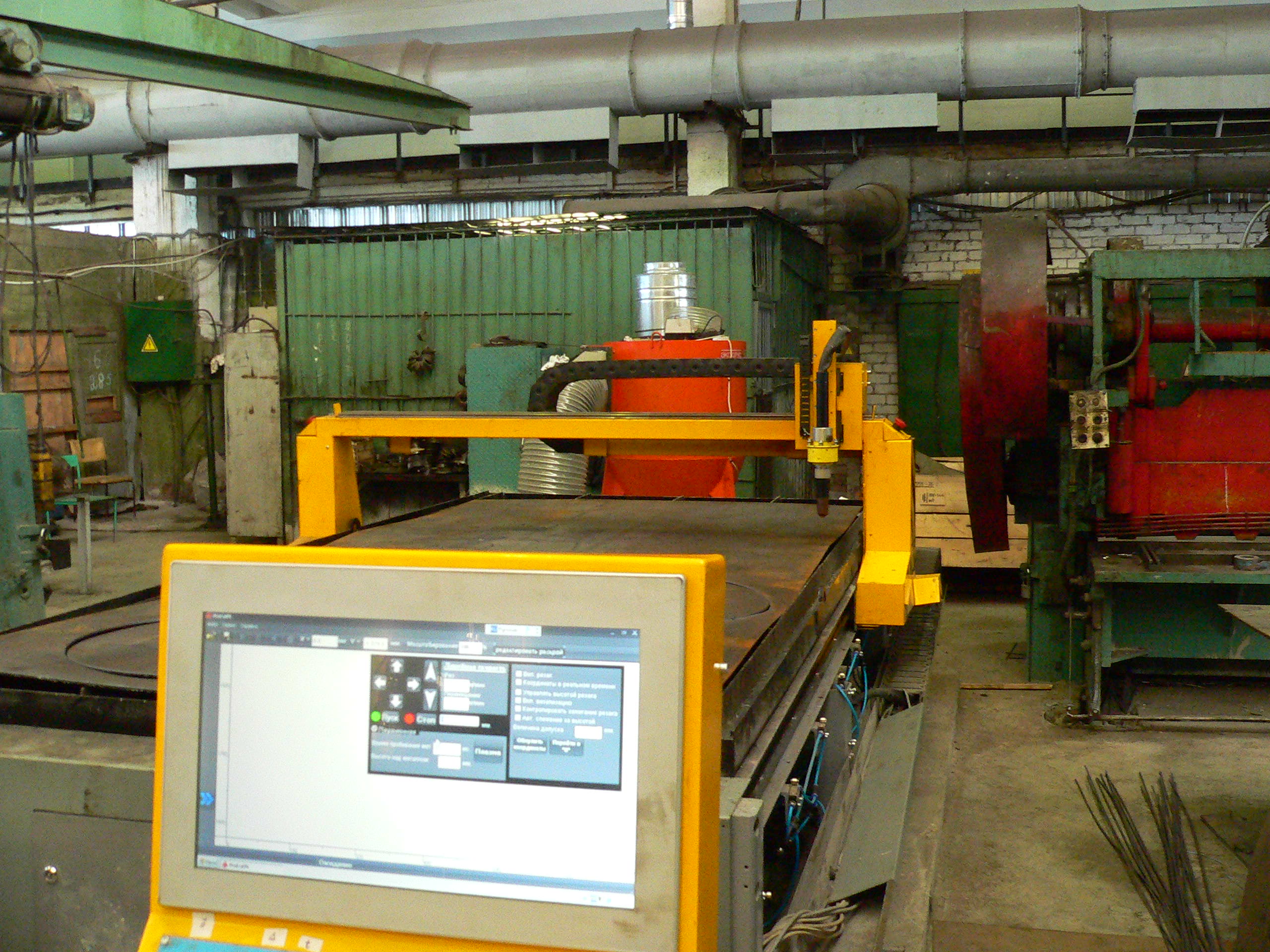 Управление открытием/закрытием секций - пневматическое. Станок рассчитан на использование любого аппарата плазменной резки. Заказчиком был выбран простой, но надёжный АПР-150 (на фото - красненький ящик слева) с плазмотроном Trafimet C140.