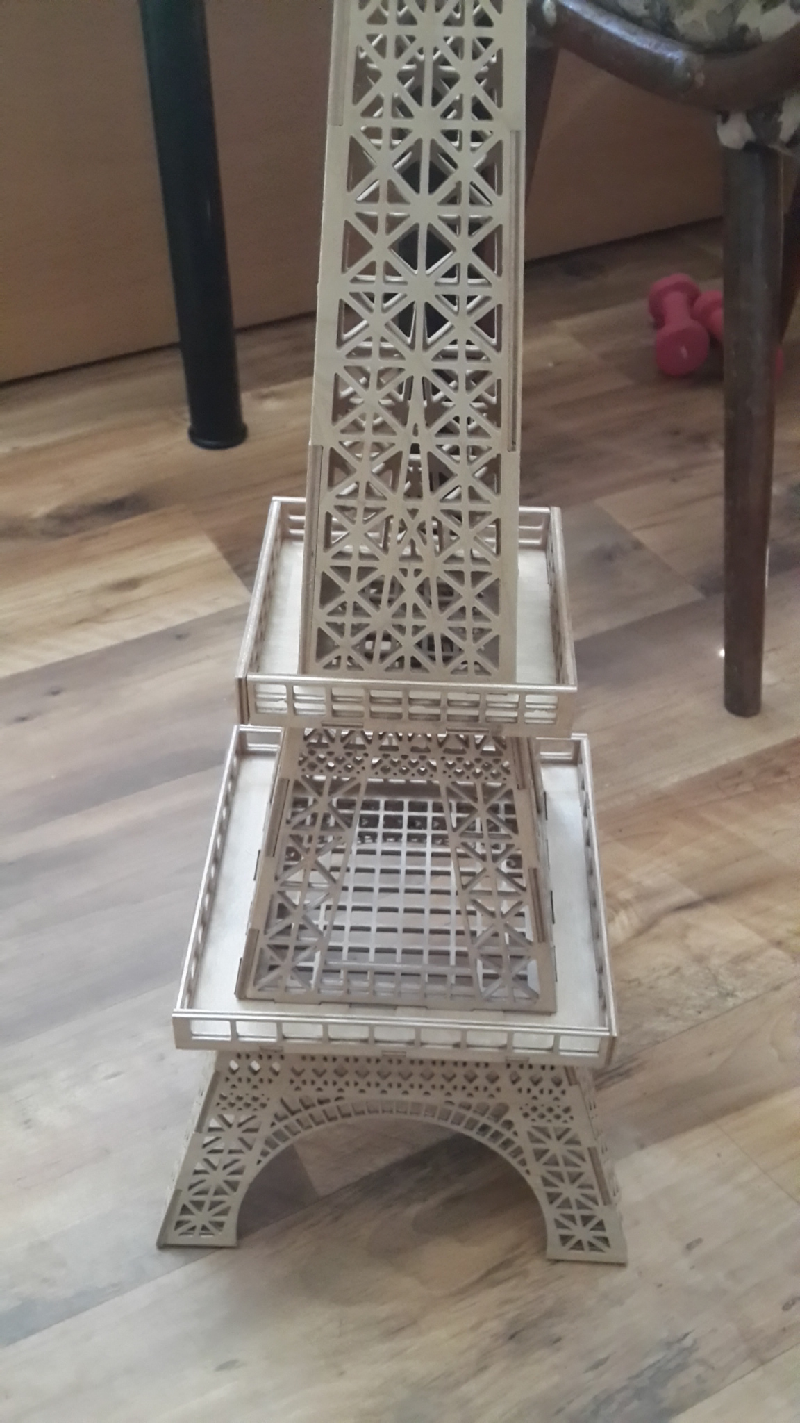 Вот избитая уже всеми ЧПУшниками Эйфелева башня :) Это тоже банальность, но мне понравилось как она смотрится, да и размер у нее получился более впечатляющий, чем я ожидал. Вырезана из 4-мм фанеры. Есть файлы для VCarve, подготовленные для этой фанеры. Что бы не дорабатывать внутренние углы напильником, наделал в VCarve в углах вырезы (Fillets). Фанеру после резания слегка отшлифовал шкуркой и прогрунтовал. Жена довольна :)