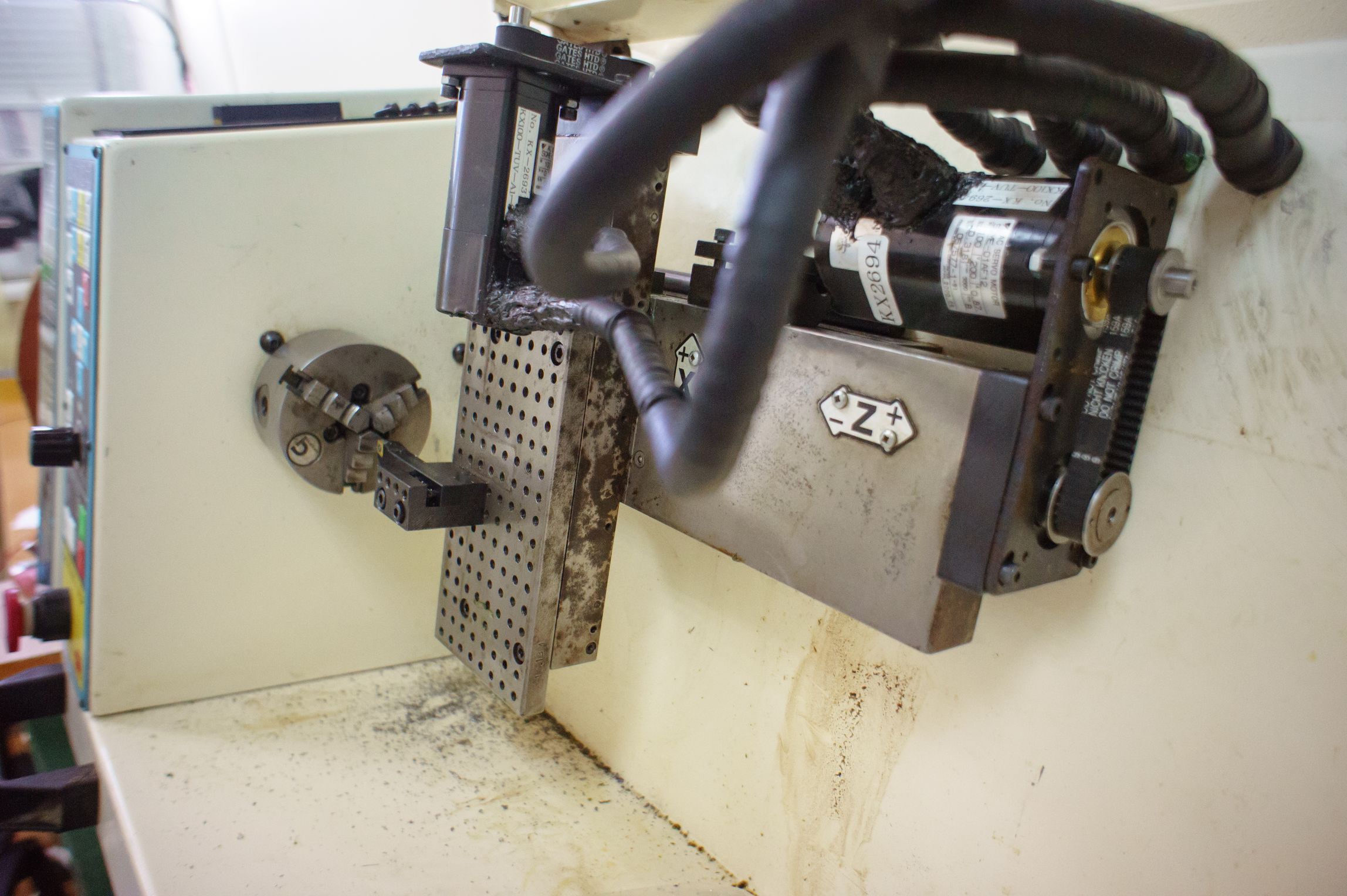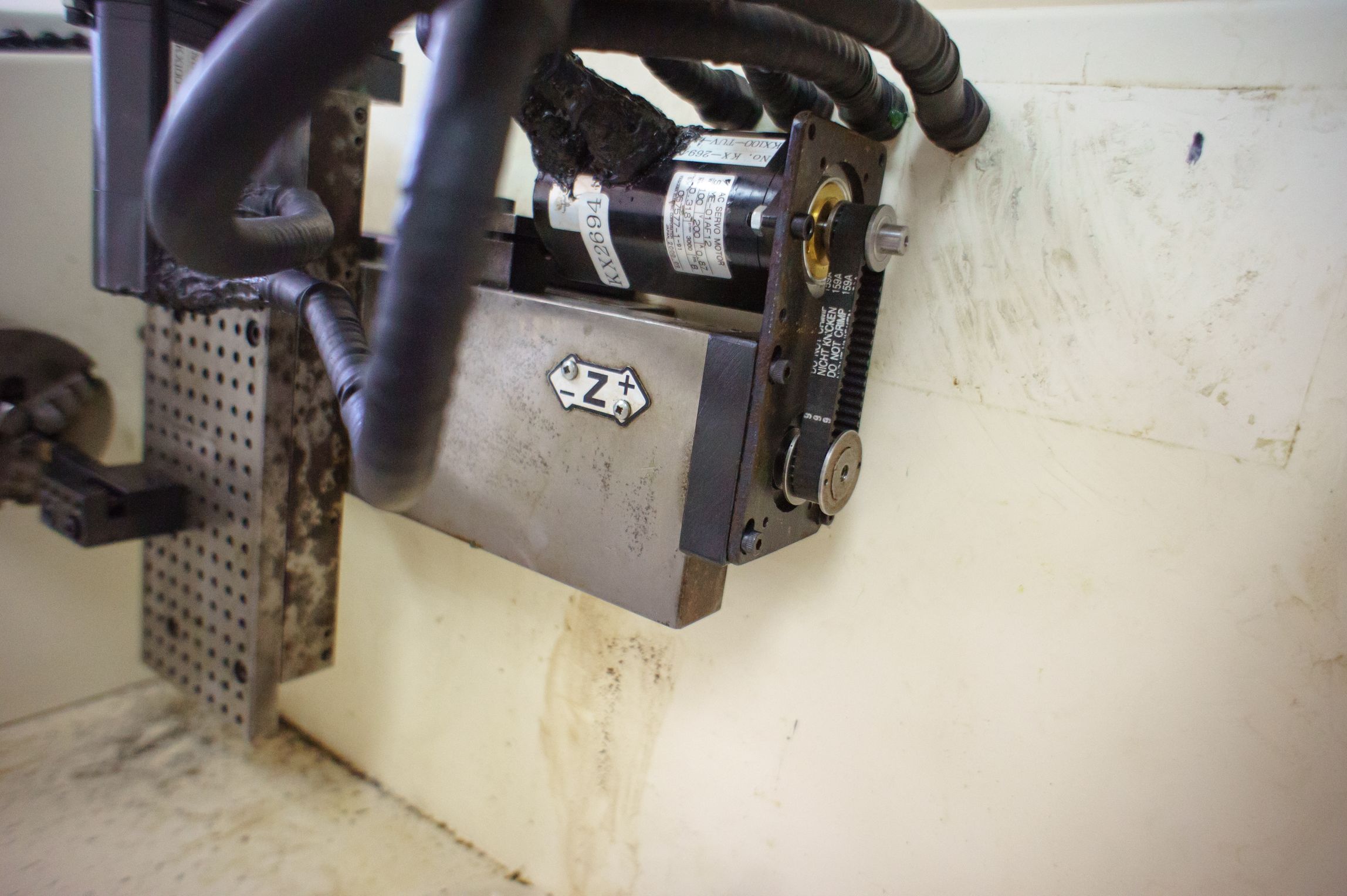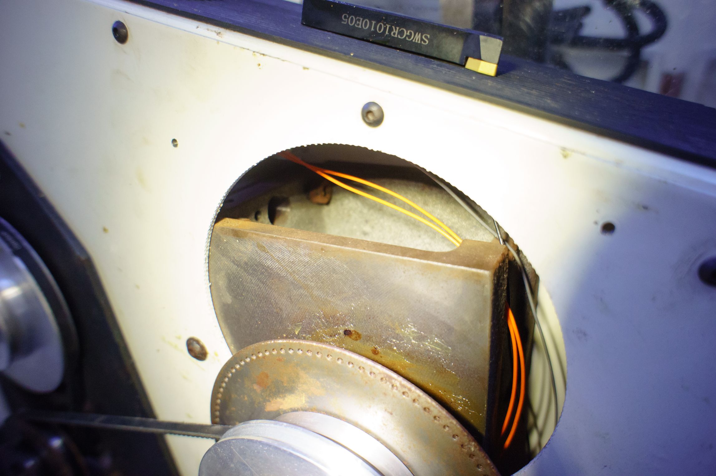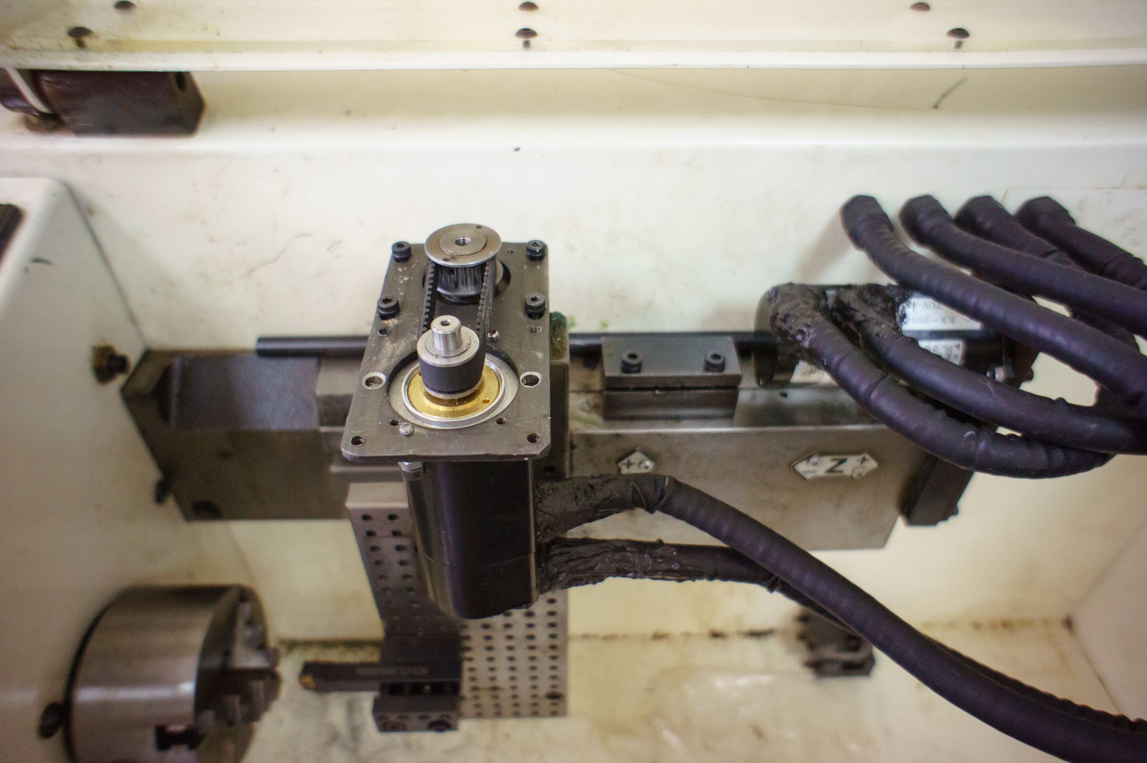 Да, коллекторная серва. Шпиндель в такой, заводской, конфигурации может только вращаться в ту или иную сторону. Без позиционирования. Энкодер, диск с отверстиями (100 шт), для измерения скорости и возможности нарезания резьб. Сейчас не используется.