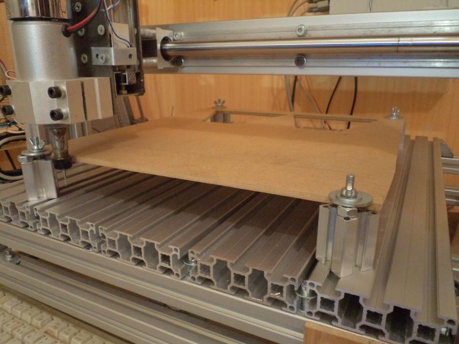 поскольку первое, что пришлось делать на станке это фрезеровать меламин (листовой материал), пришлось думать и о креплениях листа на станок