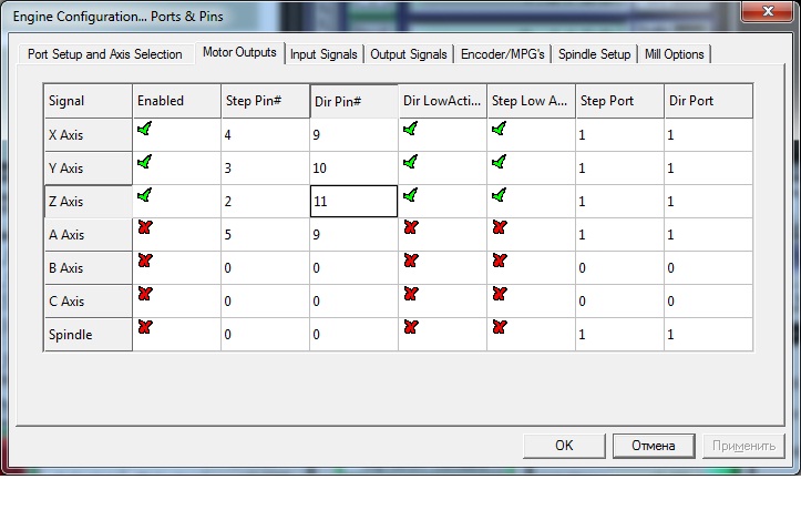 Распиновка не для Mach3 а для Ncstudio на схеме! И Pin1 на Probe идет.Igor_Ch писал(а):Дык вроде и настраиваю, как на схеме. Но на хоткеи не реагирует, т.е не ездят движки по стрелочкам. Прилагаю скрин. Может неправильно настроил, подскажите.